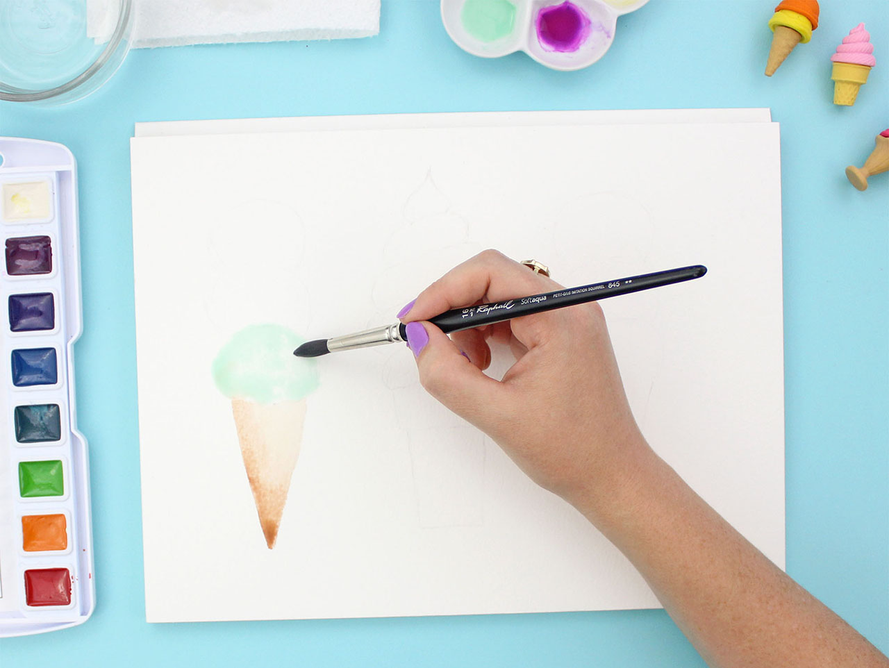 Very lightly sketch out your ice cream cone shapes. You don’t need to sketch out a lot of details, just mark where the cones will be and generally where each scoop of ice cream will be. Mix some colors that you are planning on using and test them on scraps of paper. You can use the lid of this set to mix your paints if you don’t have an extra paint palette.