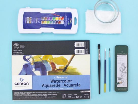 Prepare your work area and your supplies. I like to use at least two jars of water (mason jars would work): one for rinsing brushes, and one to keep clear to use while you’re painting. IThese Prang watercolors are actually really amazing. Since they are semi-moist, it’s easy to get a lot of thick pigment. While this is a good thing, just remember to use lots of water. A little bit of paint goes a long way. I also like to use a spray bottle of water to quickly moisten the entire paint set at once.