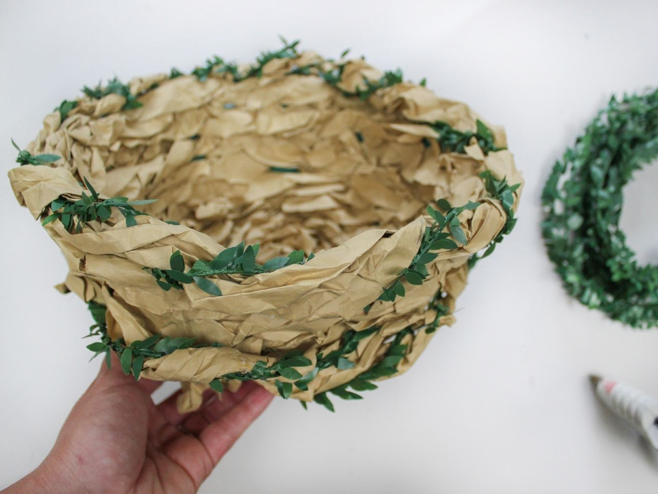 Using the remaining Boxwood Leaf Ribbon Roll and kraft paper twists, glue the paper diagonally around the outside of the bowl.