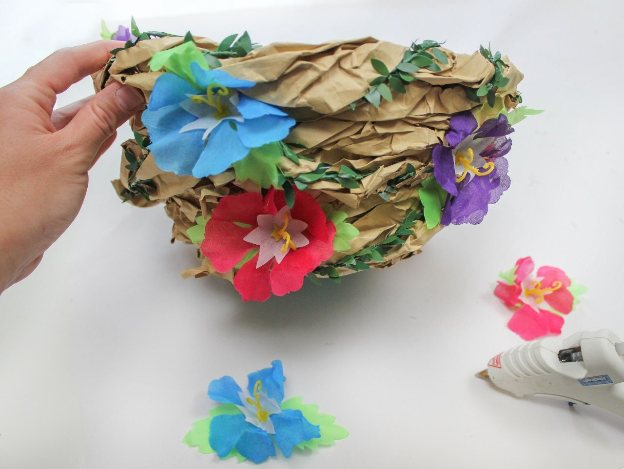 Add some color to your DIY nest by hot gluing Decorative Hibiscus flowers around the outside of the bowl. The nest is now complete!