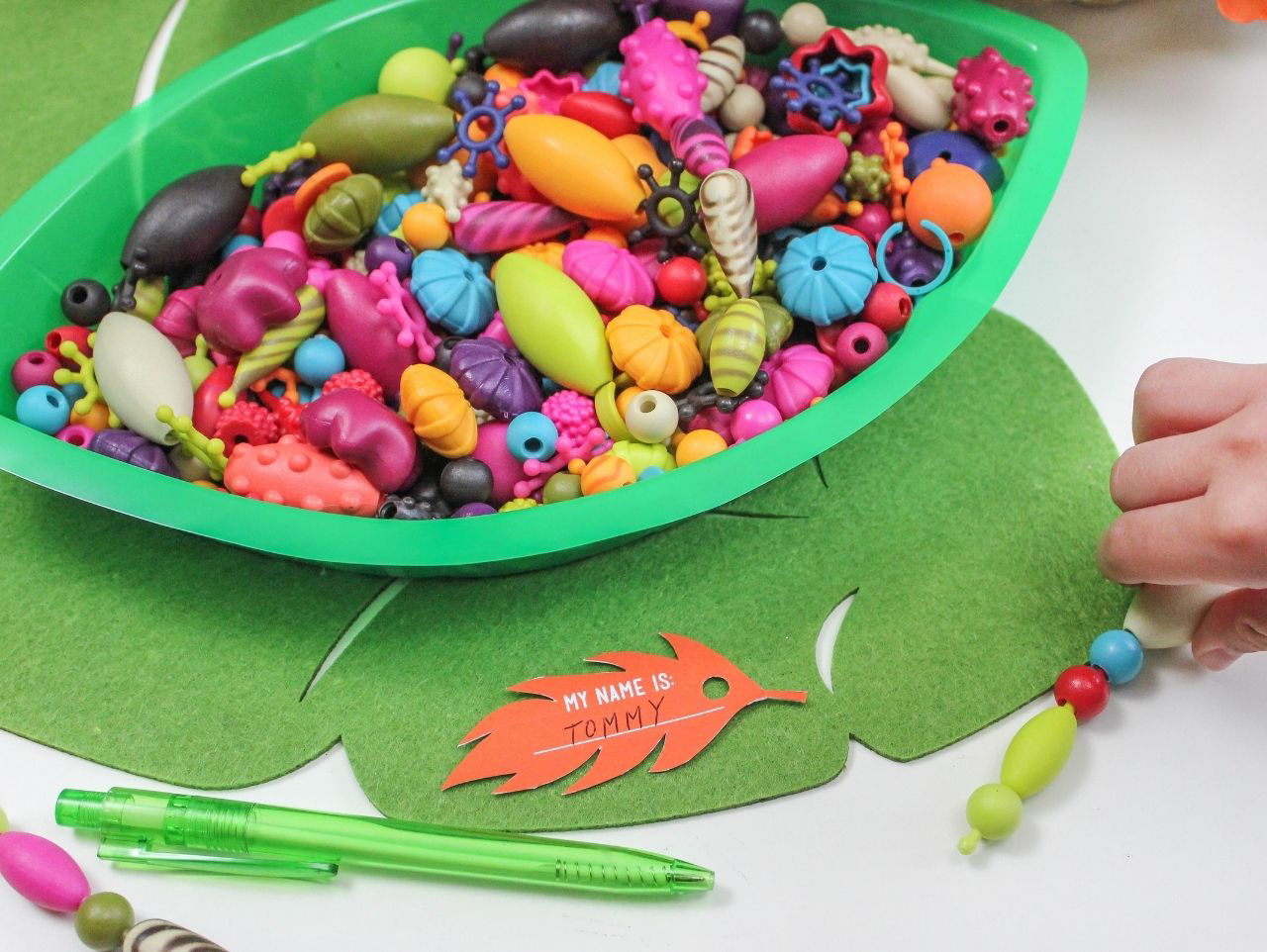 Before the party, arrange the Rainforest Bird Adoption Center on a table that all of your little party guests can easily access. The 3D Tropical Plant Stand-Ups create a perfect backdrop for the adoption center. Start by arranging the DIY nest and all of the Tropical Stuffed Birds on the table with the printable adoption sign, adoption certificates, and name tag feathers. Next, fill a Palm Leaf Serving Tray with Pop-Arty Beads.