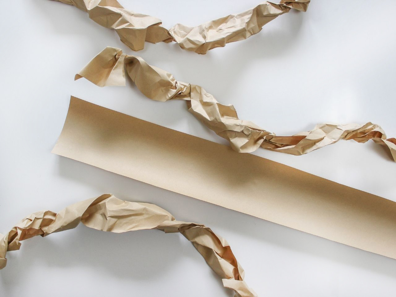 First, let's create the DIY nest for all of the Tropical Stuffed Birds we'll putting up for adoption! Start by cutting a stack of paper strips from the Kraft Paper Tablecloth Roll. The strips of paper should be roughly 4 inches wide. Twist and bend all of the paper strips to give the effect of whimsical branches.