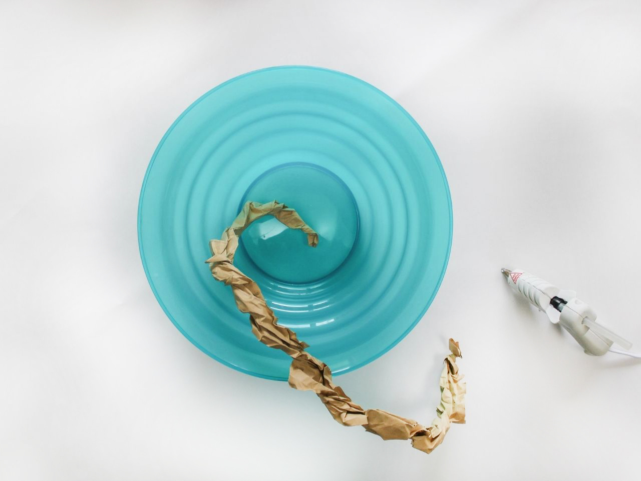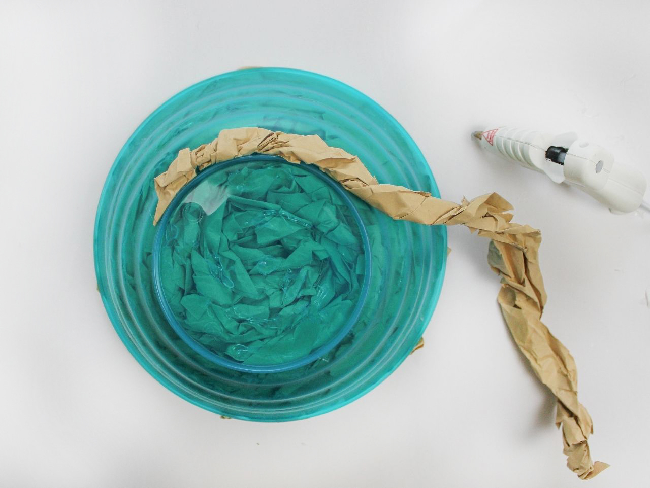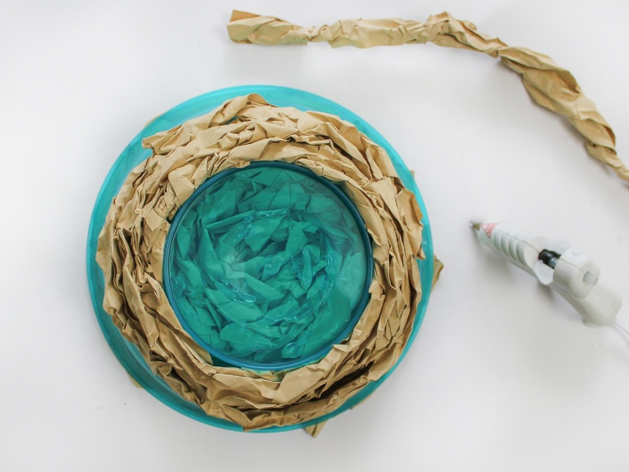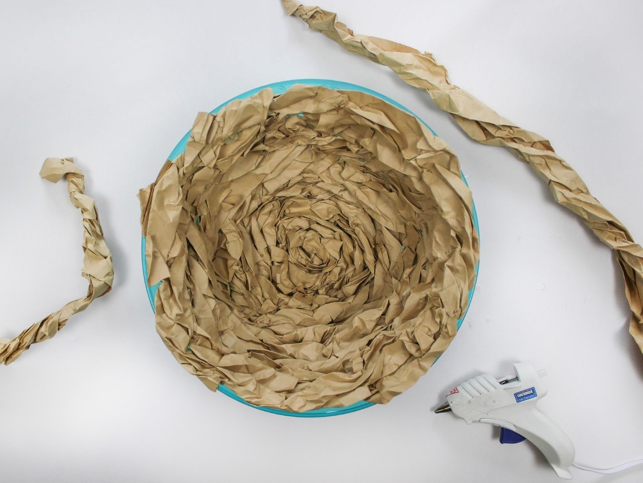 A Blue Plastic Serving Bowl will be the foundation of our nest. Apply a small amount of hot glue in the center of the serving bowl and adhere one of the twisted paper strips in a spiral shape. Continue that spiral shape by wrapping the twisted paper around the center spot, hot gluing as you go to secure the paper. Continue the same spiraling and gluing of the twisted paper that you started in Step 3 until the entire inside of the bowl is covered.