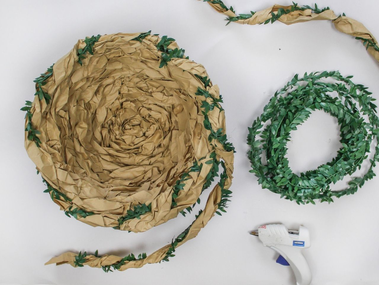 Now that the serving bowl is completely covered with the twisted kraft paper, it's time to add some details! Twist several pieces of Boxwood Leaf Ribbon Roll around the remaining twisted kraft paper strips. Encircle these at the top of the bowl, hot gluing the paper in place.