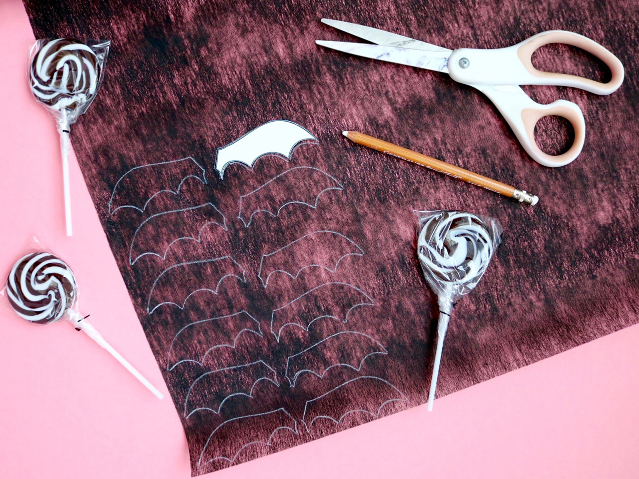 To begin creating your bats, download the free lollipop bat wing template and print. Trace the wings onto black gossamer using a chalk pencil and then carefully cut out two wings per lollipop.
