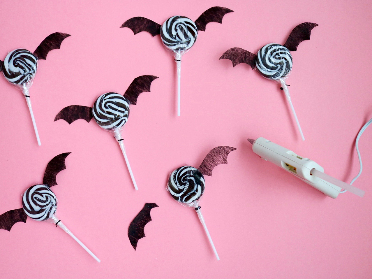 Attach each pair of wings to the backs of black and white swirl lollipops using hot glue.