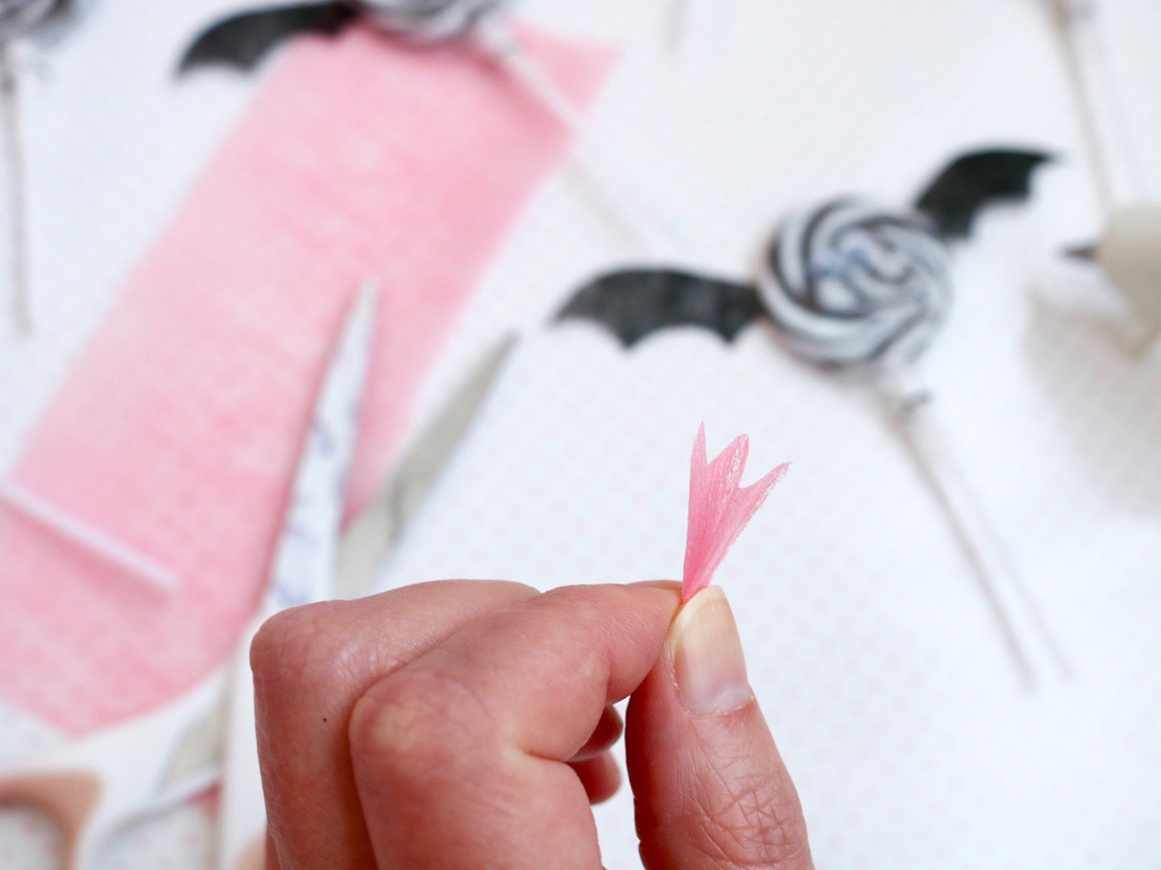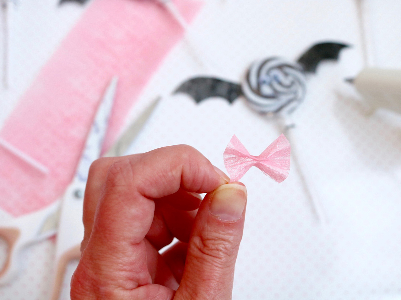 Create a cute bow using pink gossamer to adorn each of your bat lollipops. Start by cutting a piece of pink gossamer about 2" long by 1" wide. Fold the gossamer back and forth accordion style and then add a dab of hot glue to the middle so it keeps its shape. Trim each side to size as needed and then fluff to resemble a bow. Finally, hot glue a bow to each bat.