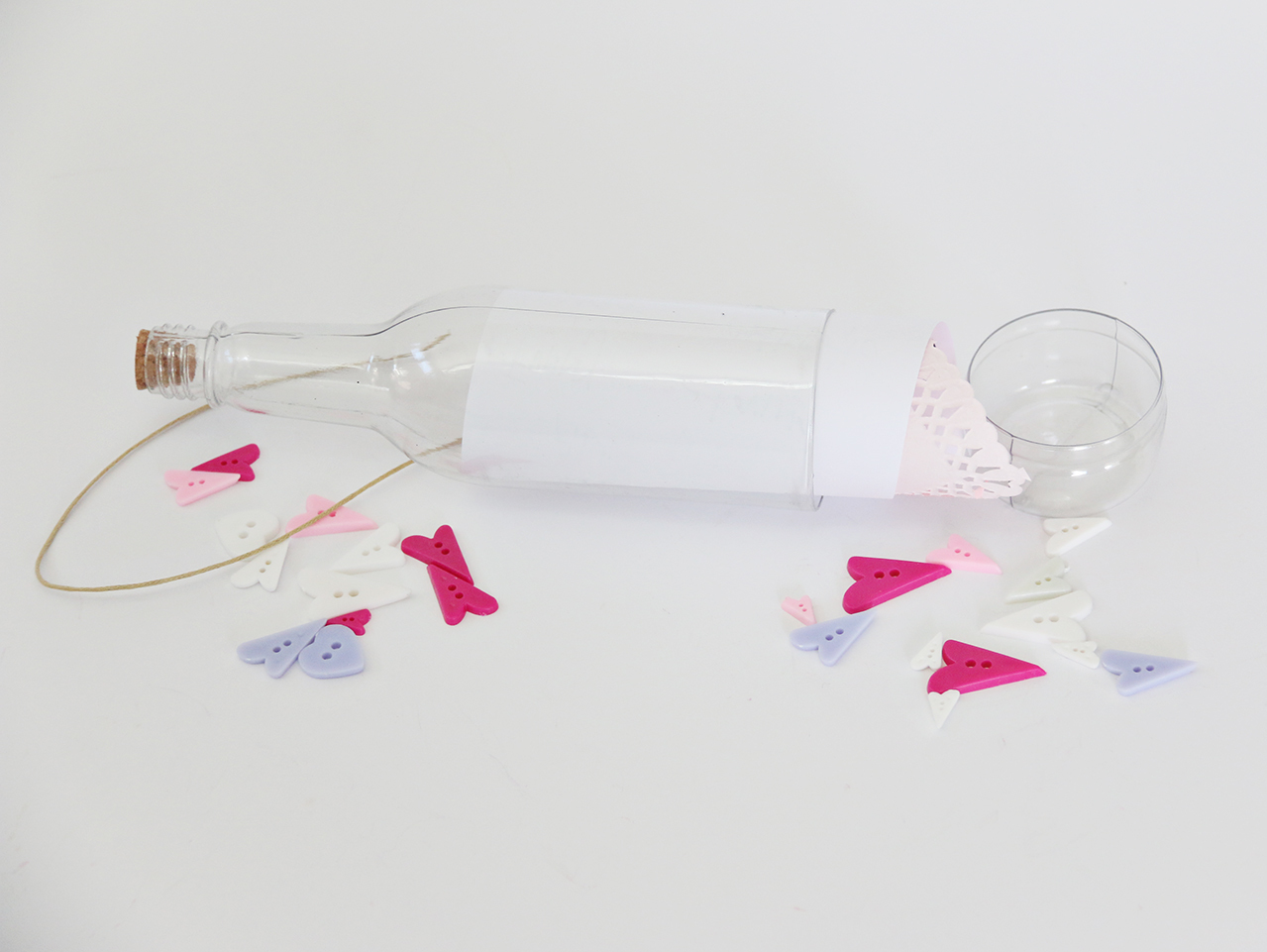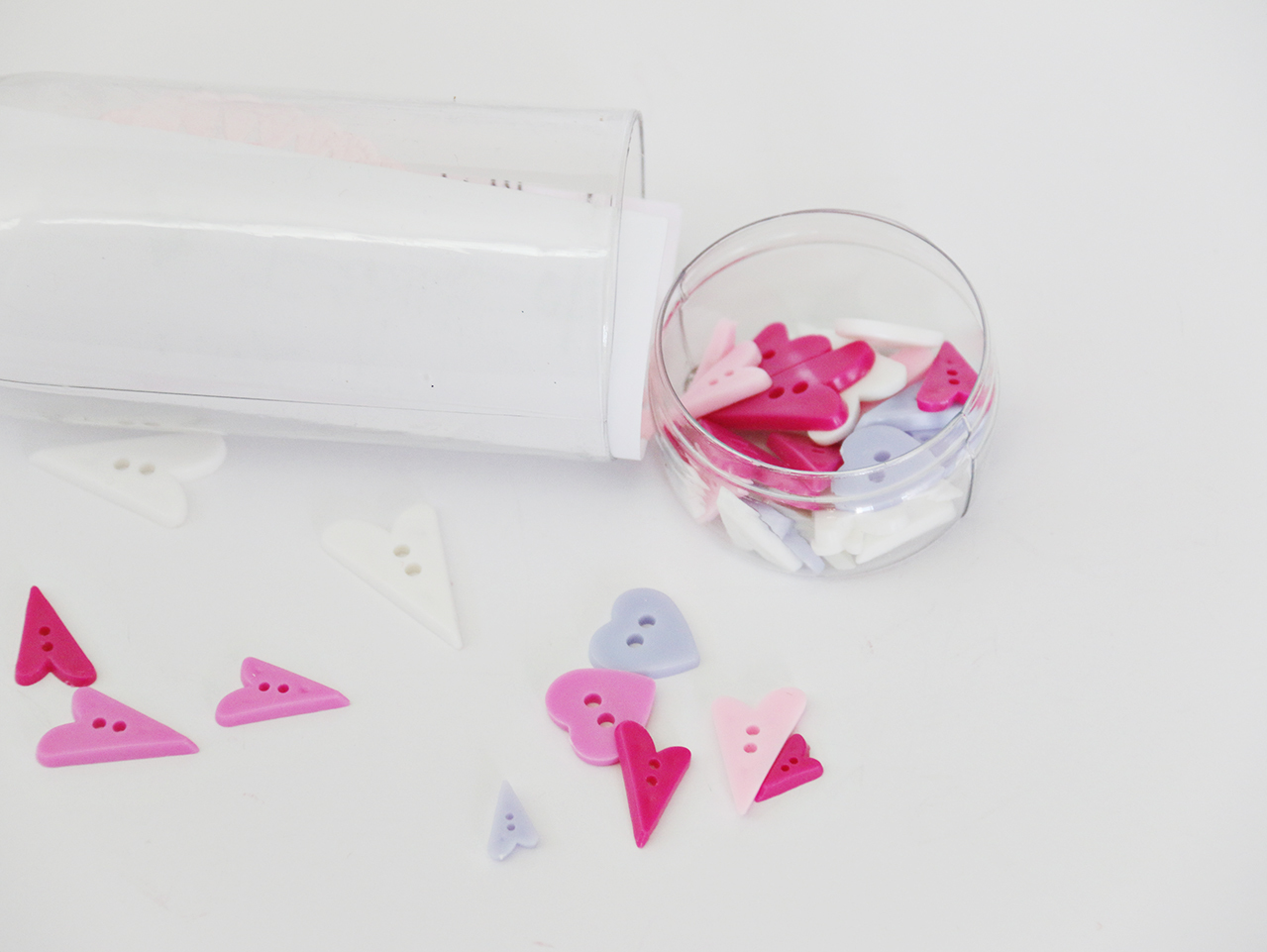 Now add some fun Valentine flair. We added some Heart Shaped Buttons, but you could add some chocolate or a favorite treat. We loved the cute hearts and the fun sound that they made in the bottle.