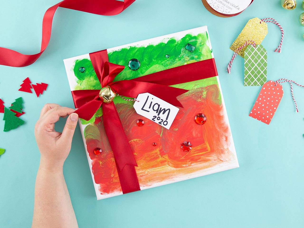 Once the paint is dry, kids can glue Christmas Jewels, Felt Christmas trees and other embellishments onto the canvas.