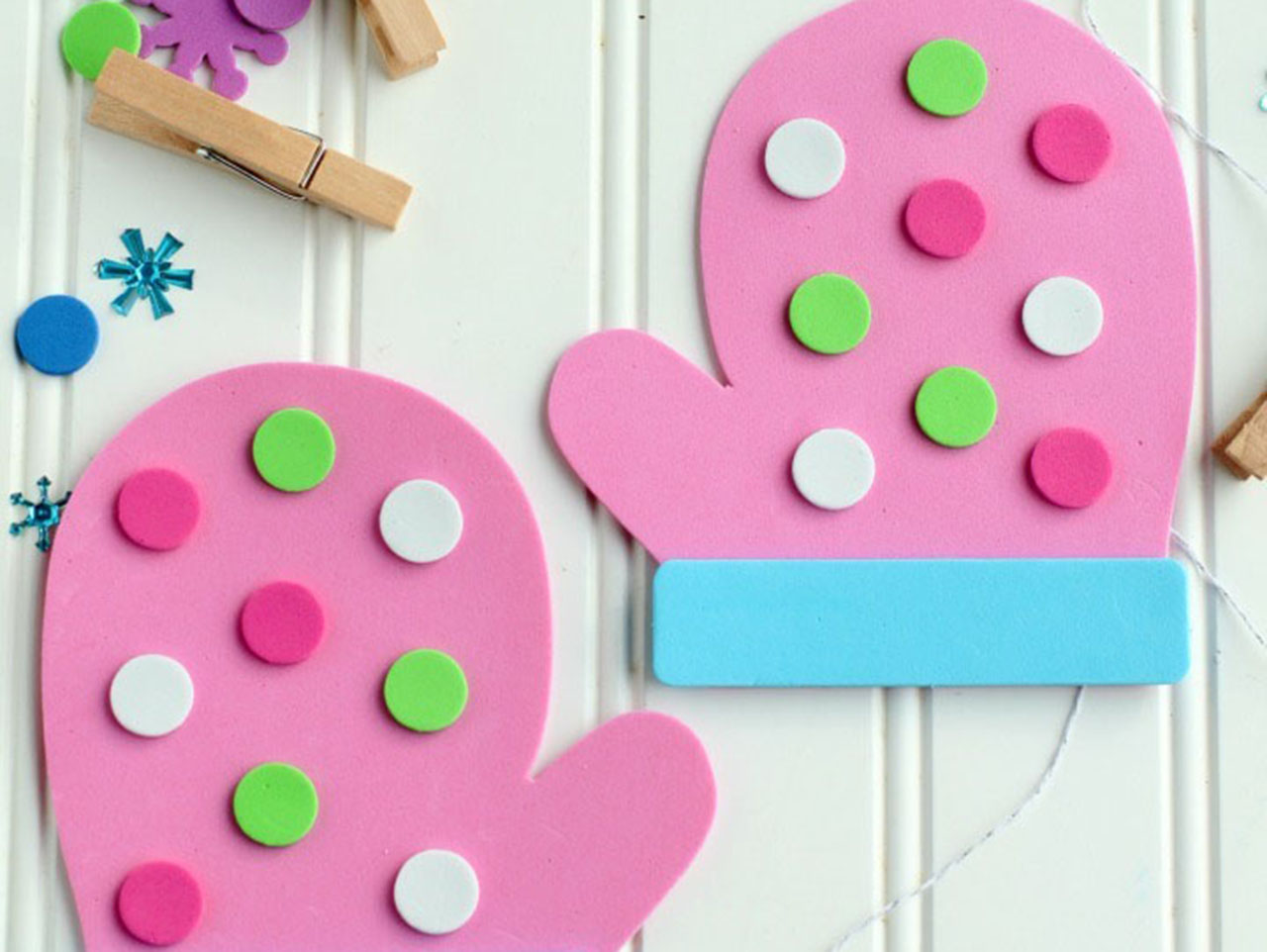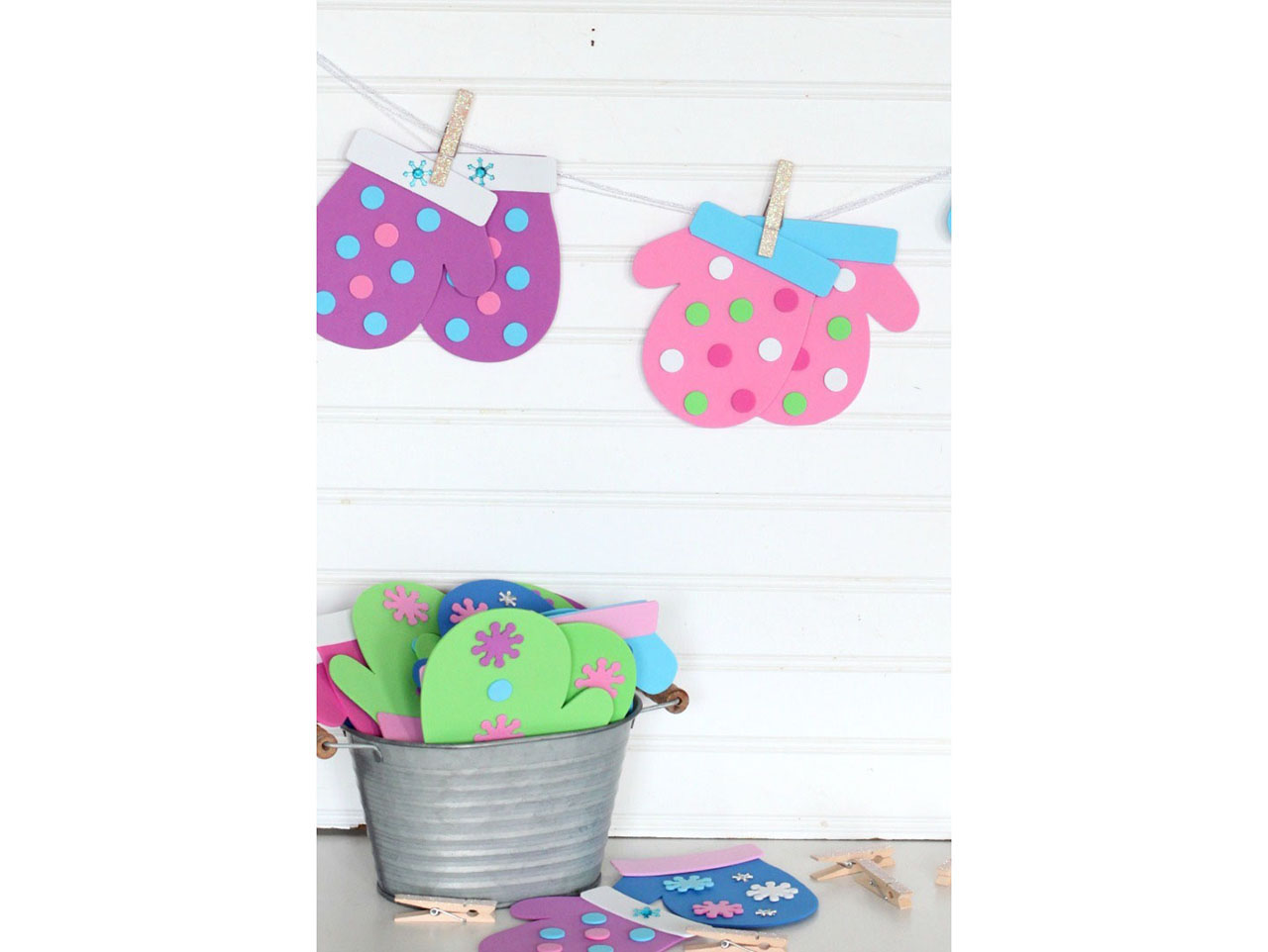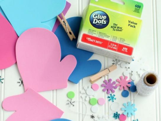 Pick out two mittens that are the same color and use glue dots to add the embellishments from the craft kit.