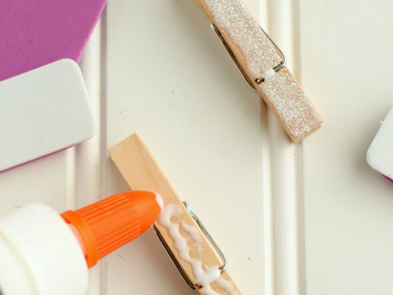 The wreath craft kit came with some white glitter and I decided to make the clothespins extra fancy. Spread some of the Elmer’s craftbond glue on the top of the clothespin.