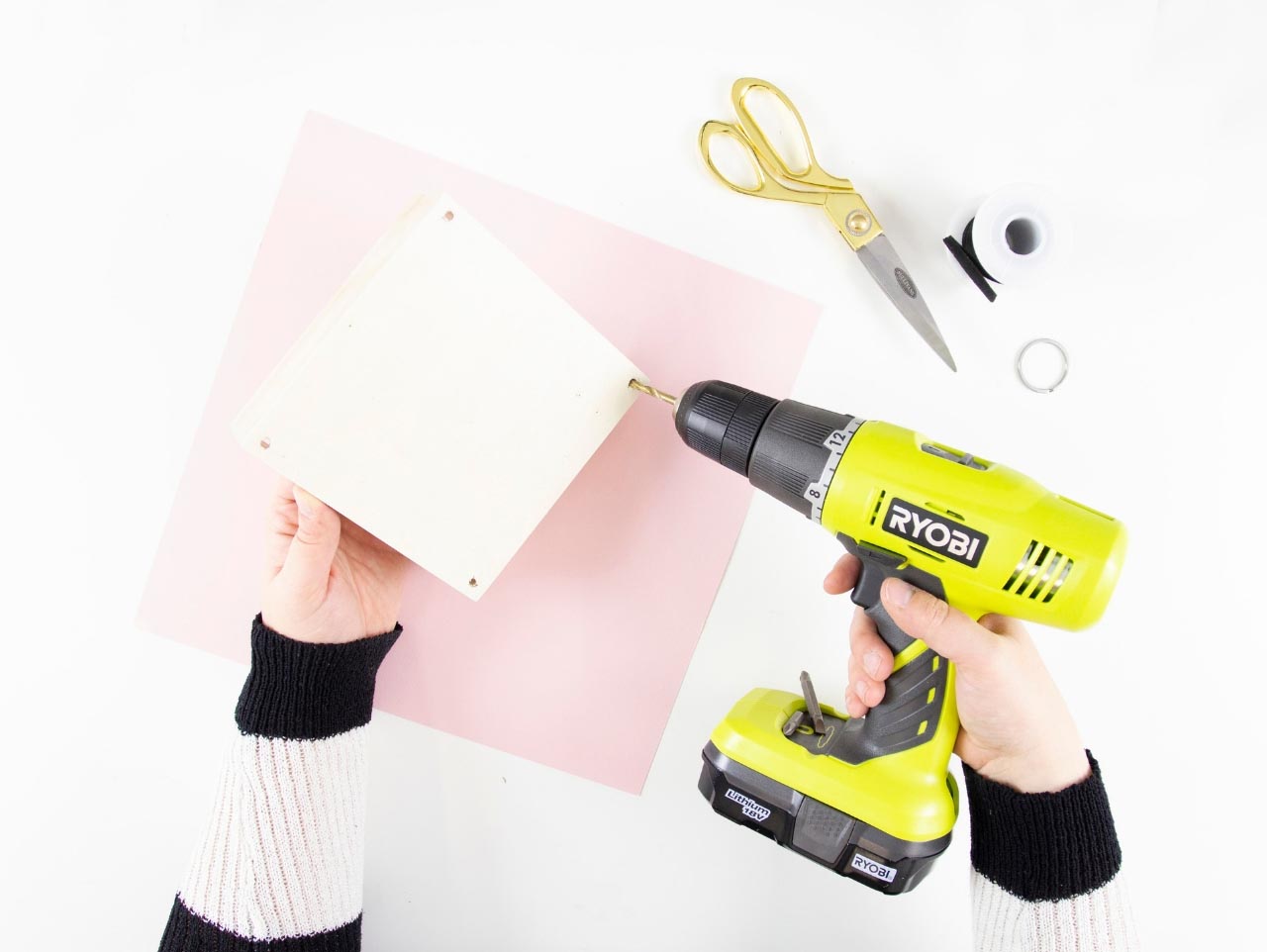 Drill holes into each of the corners of a DIY Unfinished Wood Box Frame.