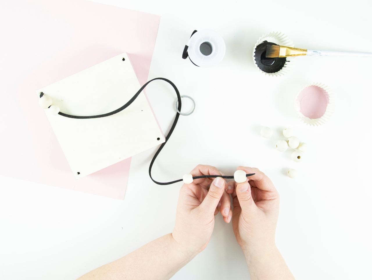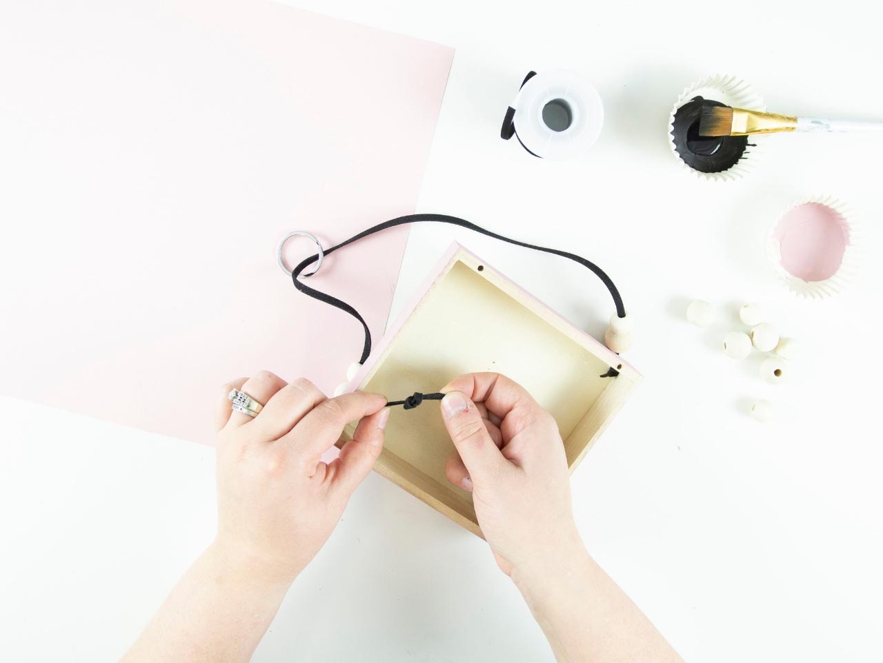 Repeat for the other holes in the wood box frame except this time, thread the cording through the existing beadable keychain instead of adding a second one.