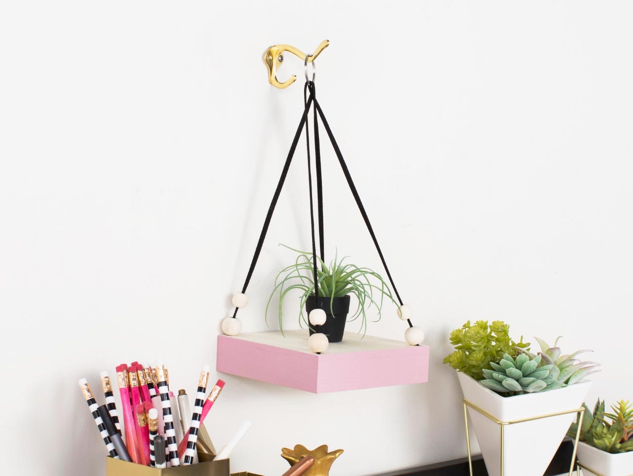 All that’s left to so is to hang the shelf on your wall. Make sure the shelf is level by adjusting the cording length on either side of the metal keychain. Set a small potted plant onto the shelf to add a bit of zen to your work space. For other modern home office wall décor ideas, be sure to check out our post, 14 Ways to DIY A Boss Babe Office here.