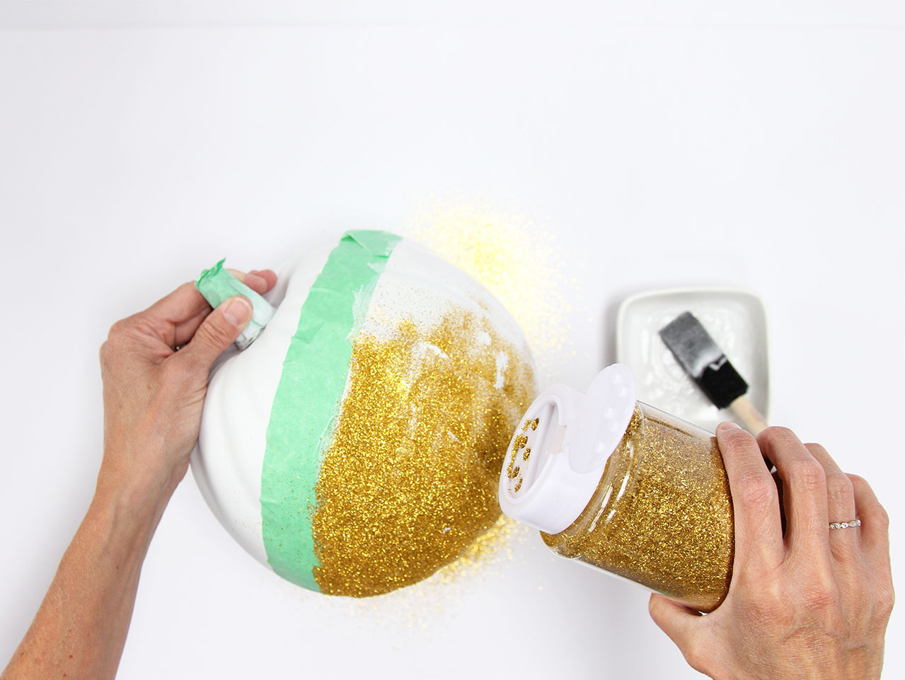 Sprinkle glitter to the area of pumpkin with Mod Podge®. Use as much glitter as you would like!