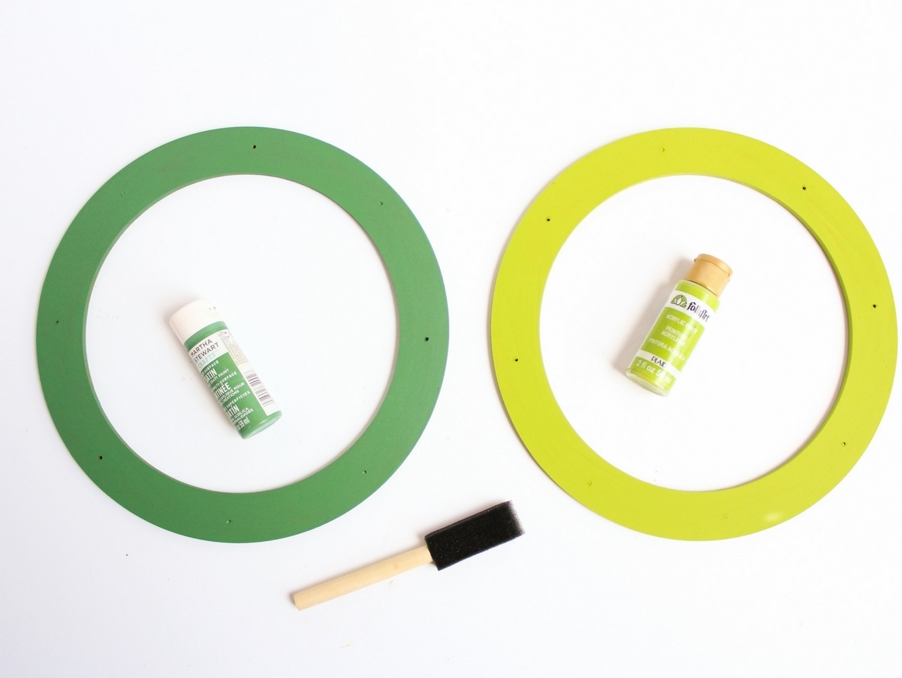 The wood craft rings come in pack of three, so you can make up to three wreaths with the supplies for this project! Paint the front of the craft rings with green acrylic craft paint and a foam brush.