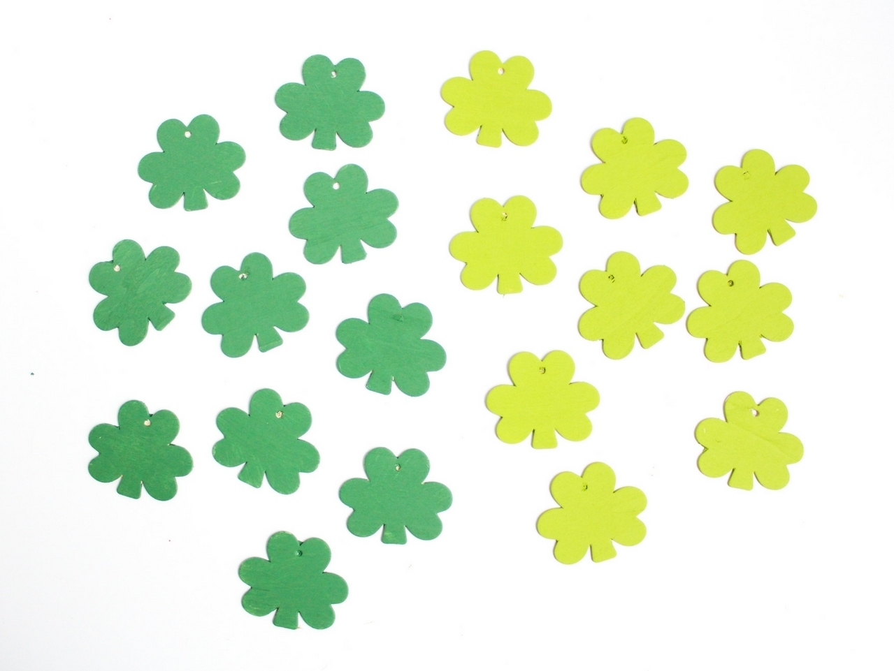 Use the remaining shimmering shamrocks to cover the hole at the top of the wood shamrock ornaments by gluing one on top of each of the wood ornaments.