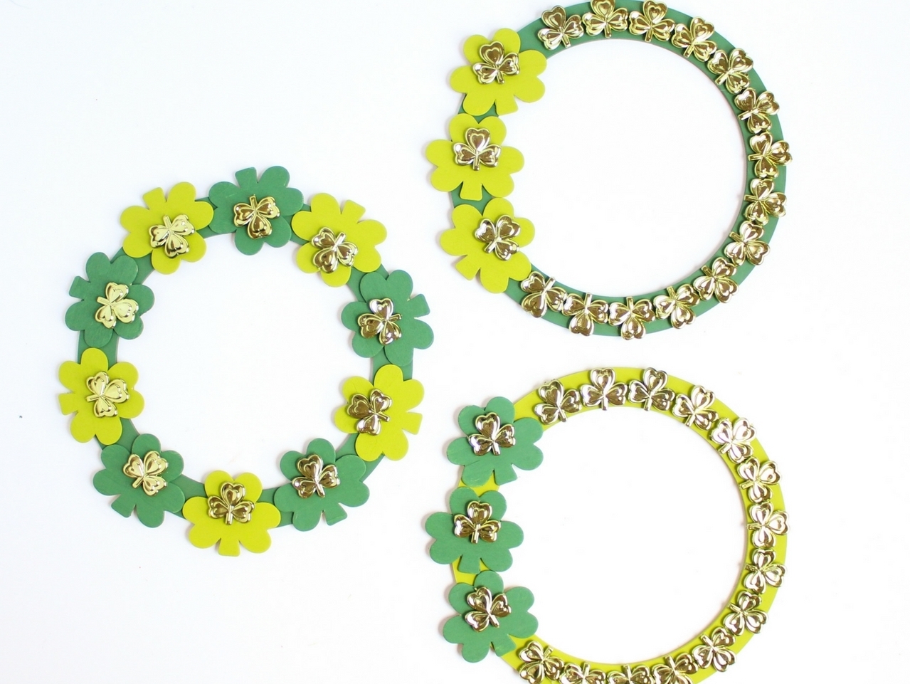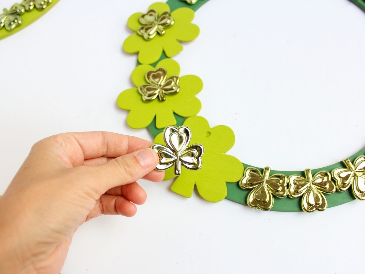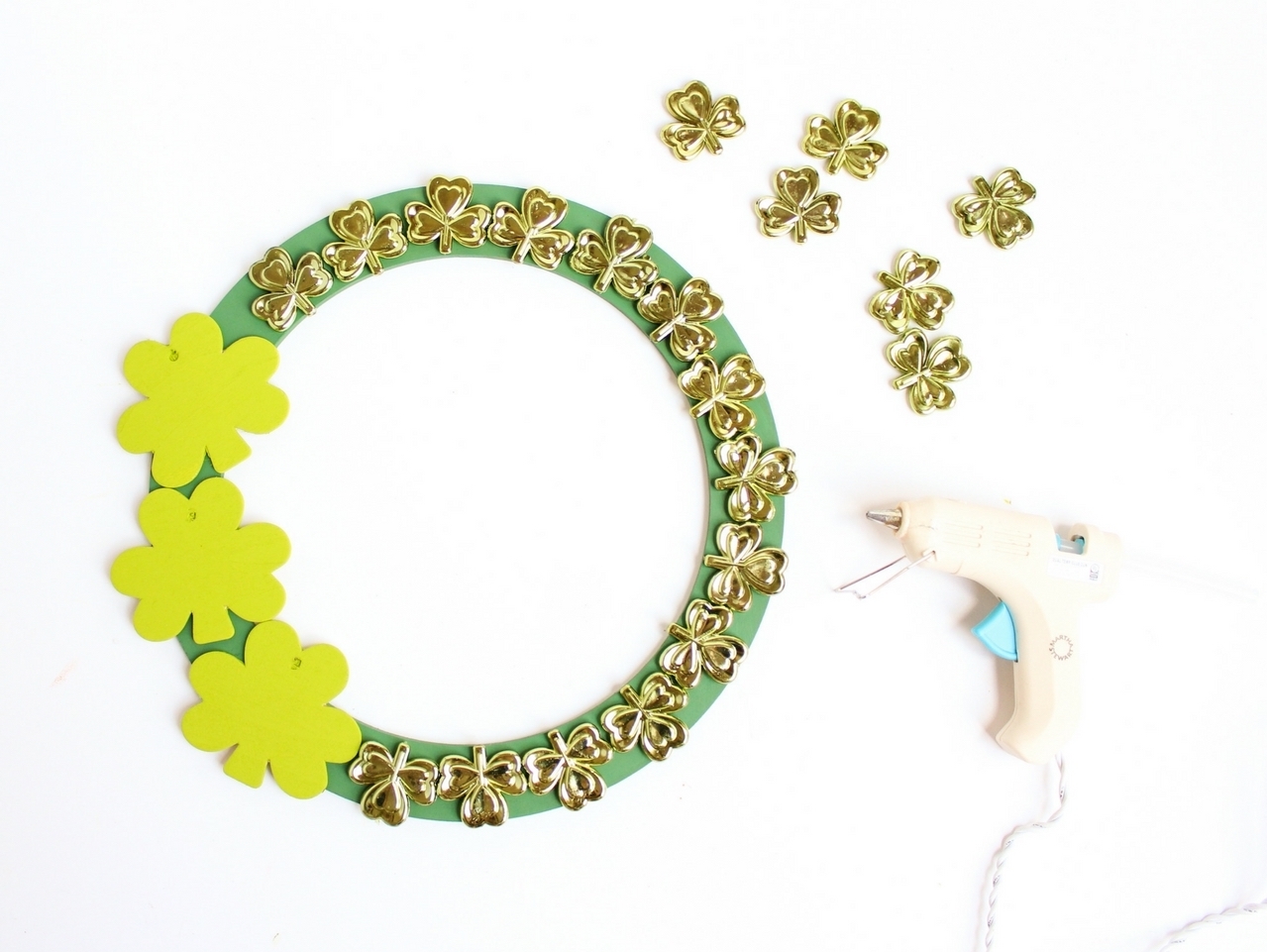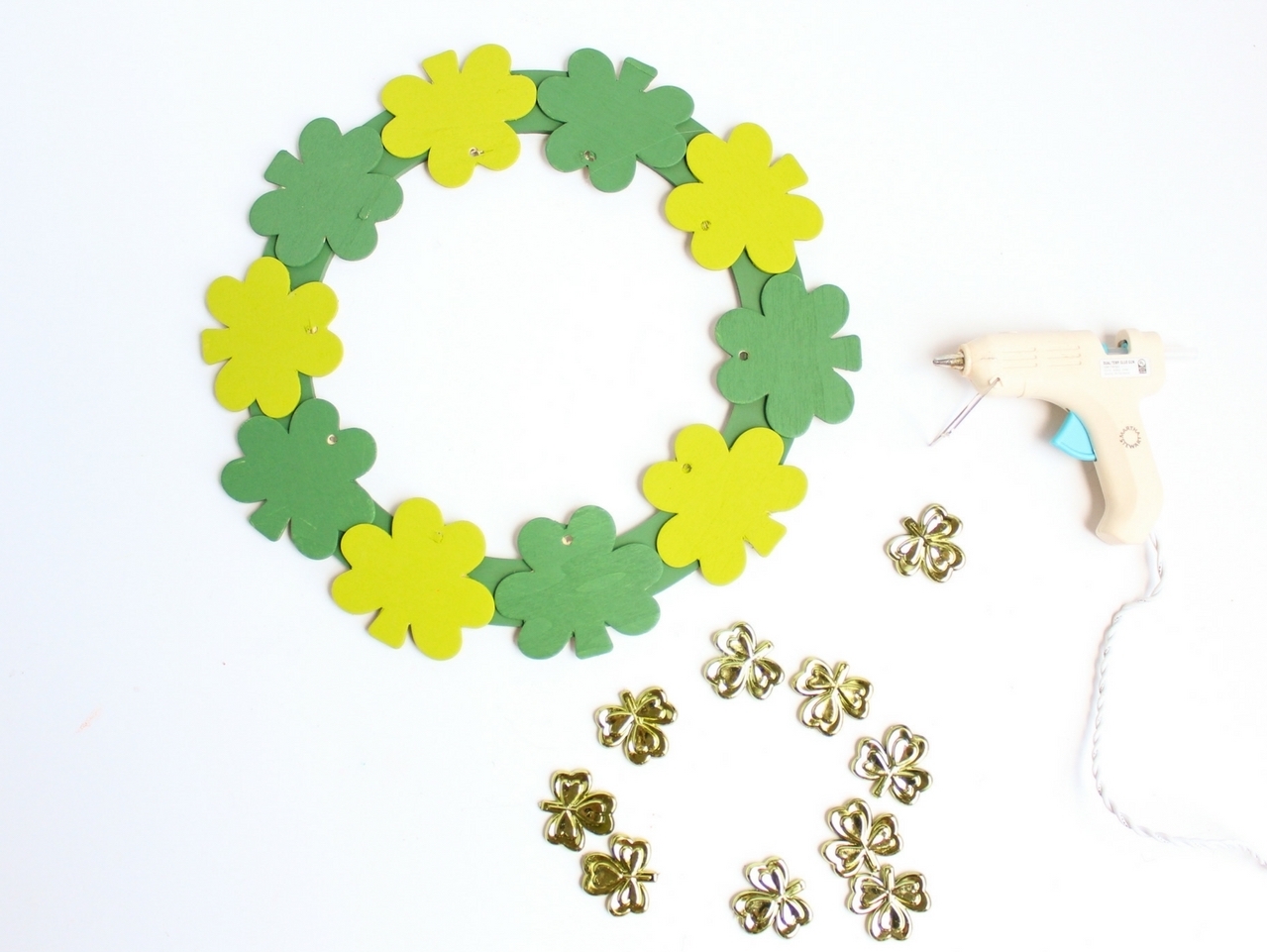 Arrange the painted wood shamrocks and shimmering shamrocks onto the wreath form and attach with a dab of hot glue on the back. You can experiment with different layouts such as using three wood shamrocks and covering the rest of the circle with the small shamrocks, or alternating light green and dark green wood shamrocks.
