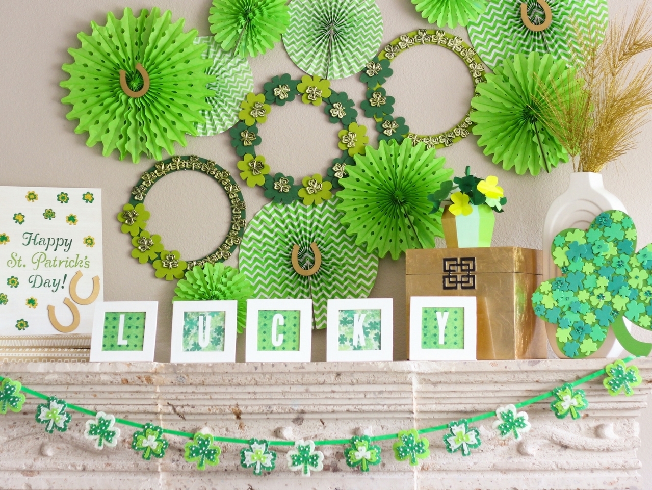 Repeat to make three wreaths to display together in a group. I hung mine over our fireplace mantel along with some green chevron party fans and green tissue fans to create a big impact for St. Patrick's Day!