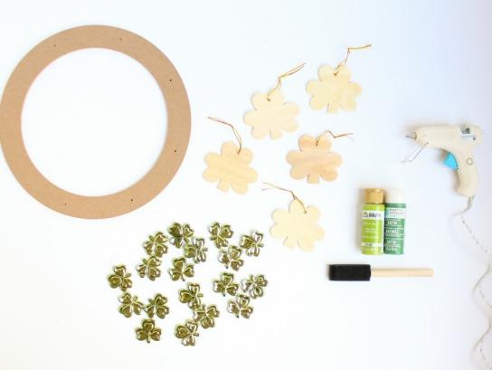Cut the strings off the wood shamrock ornaments with scissors. The shamrocks come in a pack of 12; you'll need two packages to create the three wreaths shown here. Paint half of the shamrocks light green and the other half dark green with craft paint and a foam brush.
