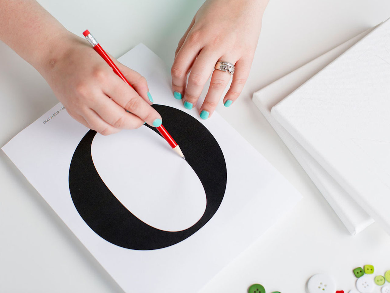 Turn the print out over and center it on top of a 8x8 canvas. Use a pencil to trace around each of the letters, one letter per canvas. Doing this will transfer the graphite from the back of the print onto the canvas.