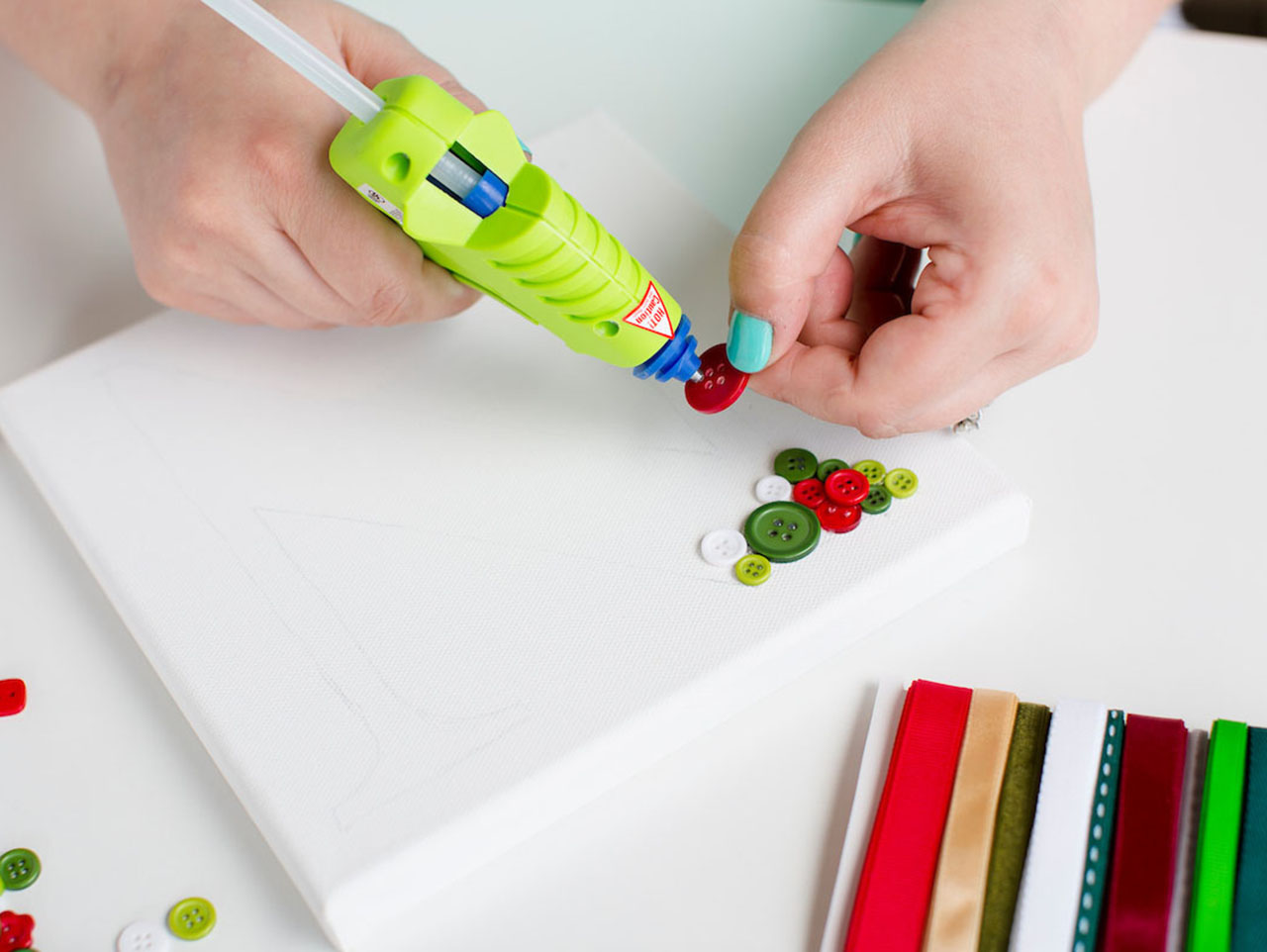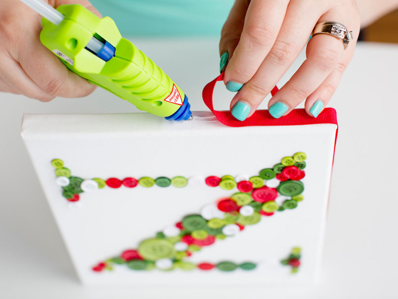Use a glue gun to adhere holiday colored buttons inside of the drawn letter, gluing buttons on top of the first layer of buttons to fill in any gaps.