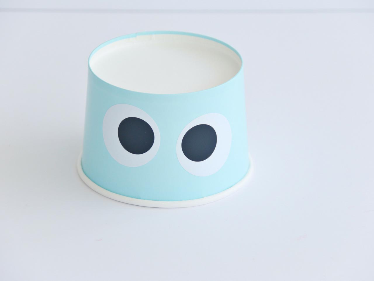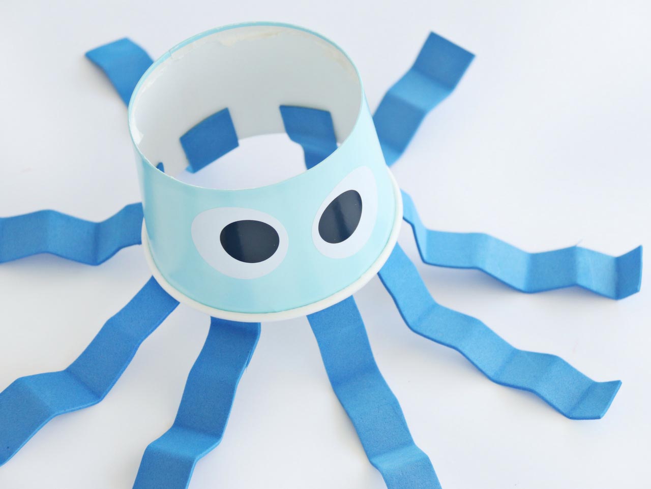 Cut out the bottom of the treat container, to create an opening. Then add the foam legs around the base of the octopus using glue dots to adhere together.