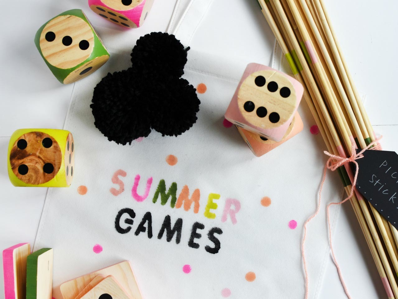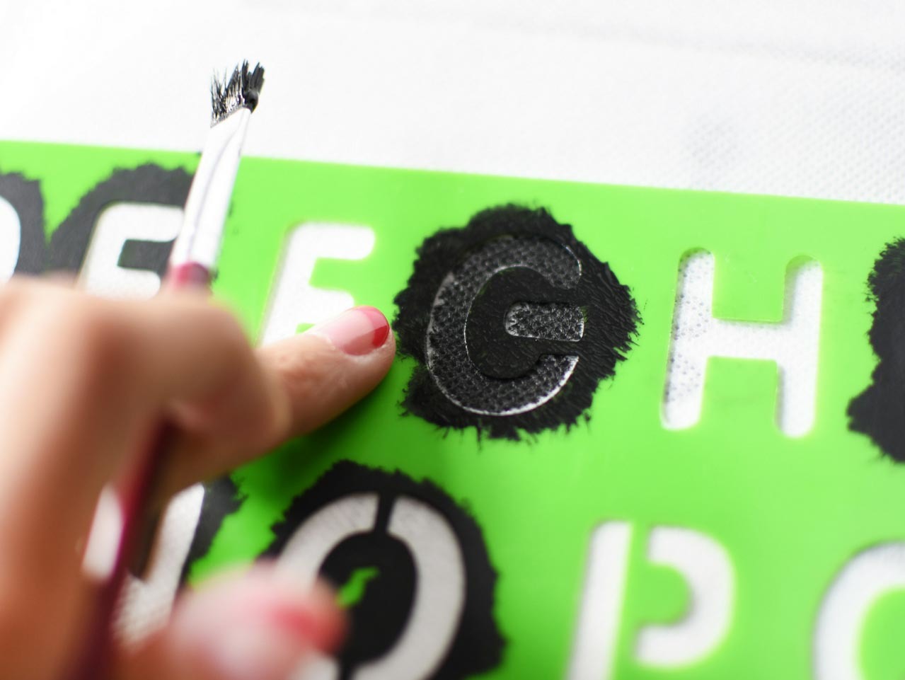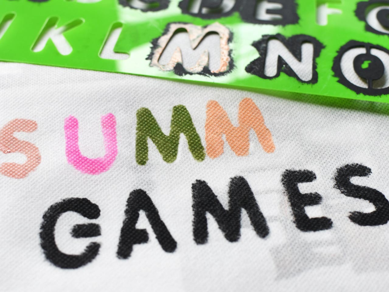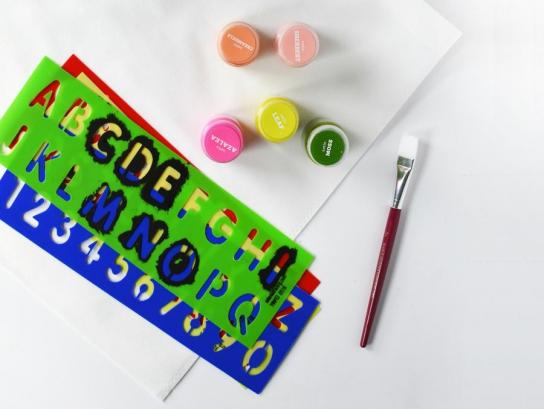Using this fun letter stencil, some black acrylic paint and a small tipped paint brush, start stamping out the word 'GAMES' on a large white tote bag.