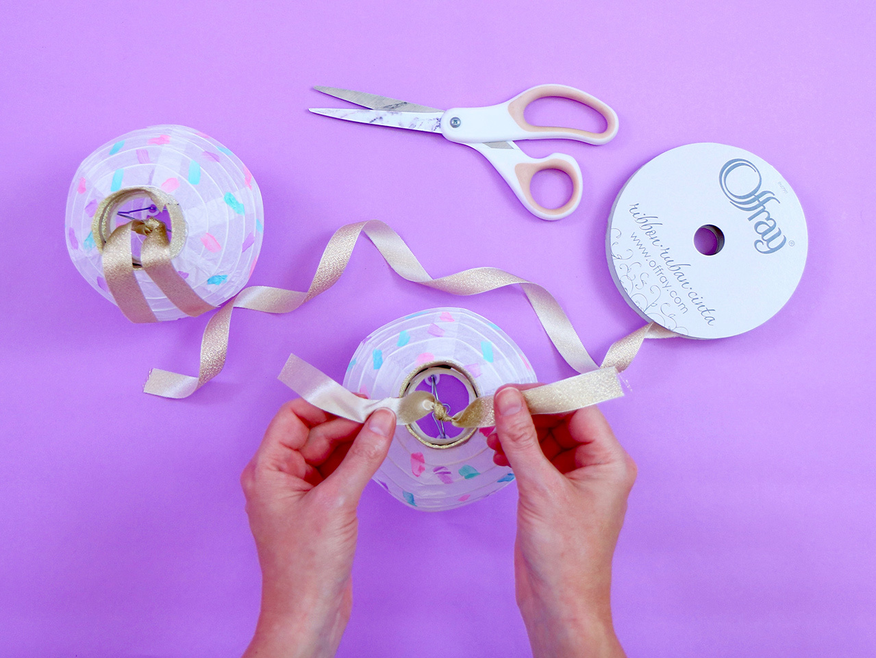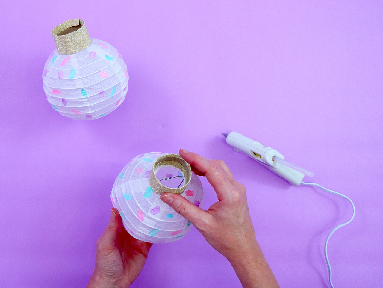 Open each of the lanterns and insert the metal piece into the center of the top hole. Pull the lantern up around the metal piece and attach the corners into the white plastic part, careful not to puncture the lantern. I chose mini lanterns in white, hot pink, mint green, light blue and lilac. Once you have them open, begin painting your design on them. I added short and simple brush strokes to mimic the look of confetti, but feel free to let your creative juices take over!