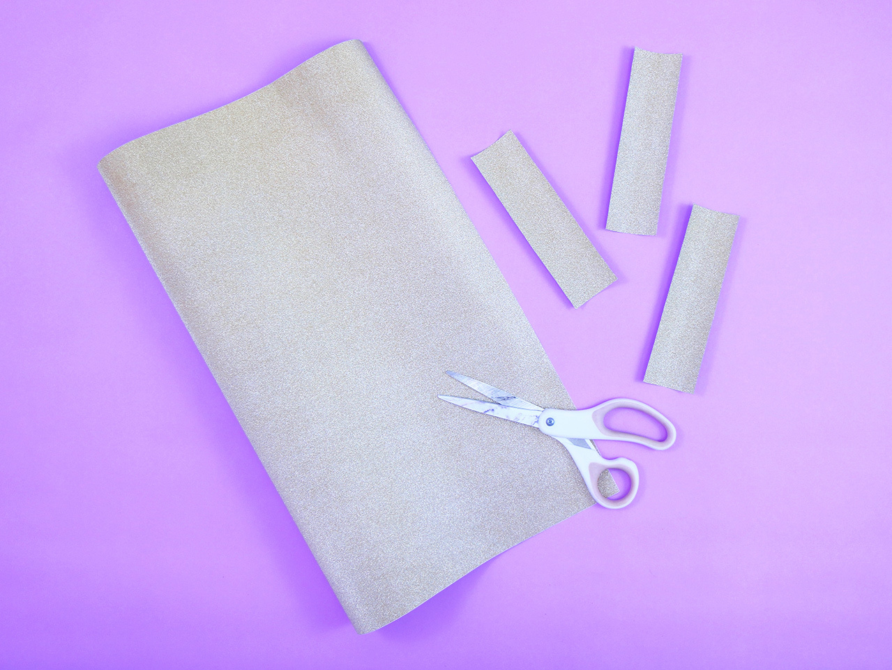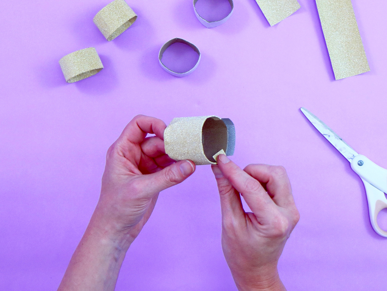 Cut strips of gold glitter contact paper in pieces that are roughly 1.5" by 3.5" in size. You want the strips to be able to wrap around the craft roll pieces, with some overlap on both the top and bottom portions.