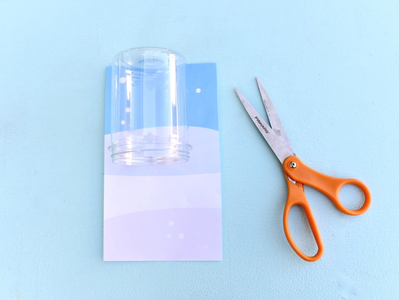 Use markers and white cardstock to create a sky scene with snow like shown. Cut the cardstock with scissors so it's the same width of half of a small jar.