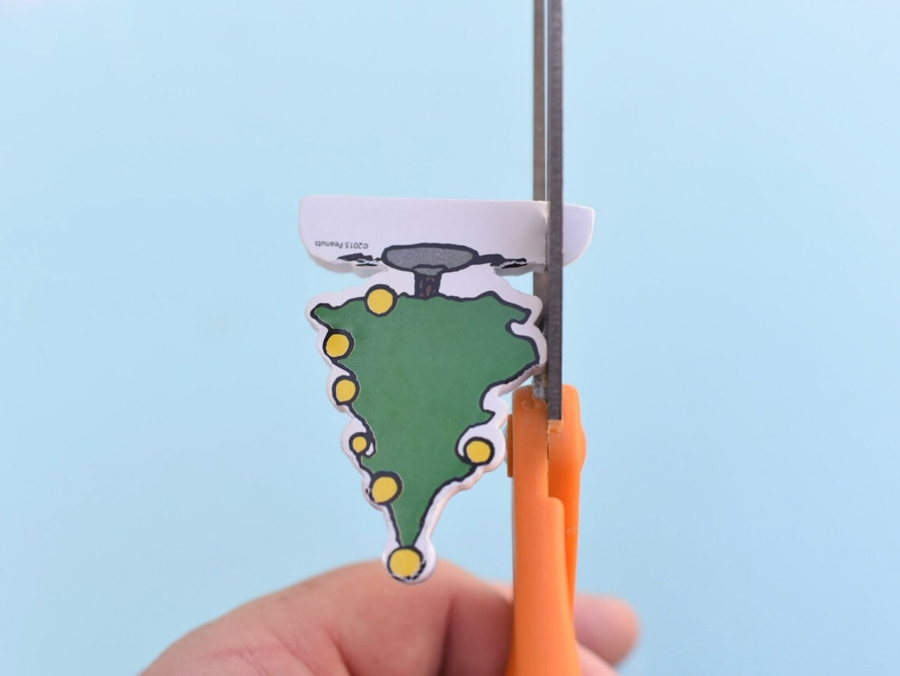 Trim the bottom left side of a foam Christmas tree with scissors.