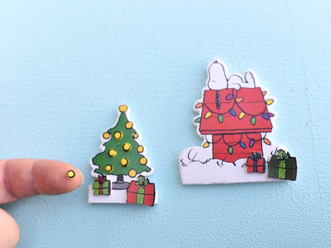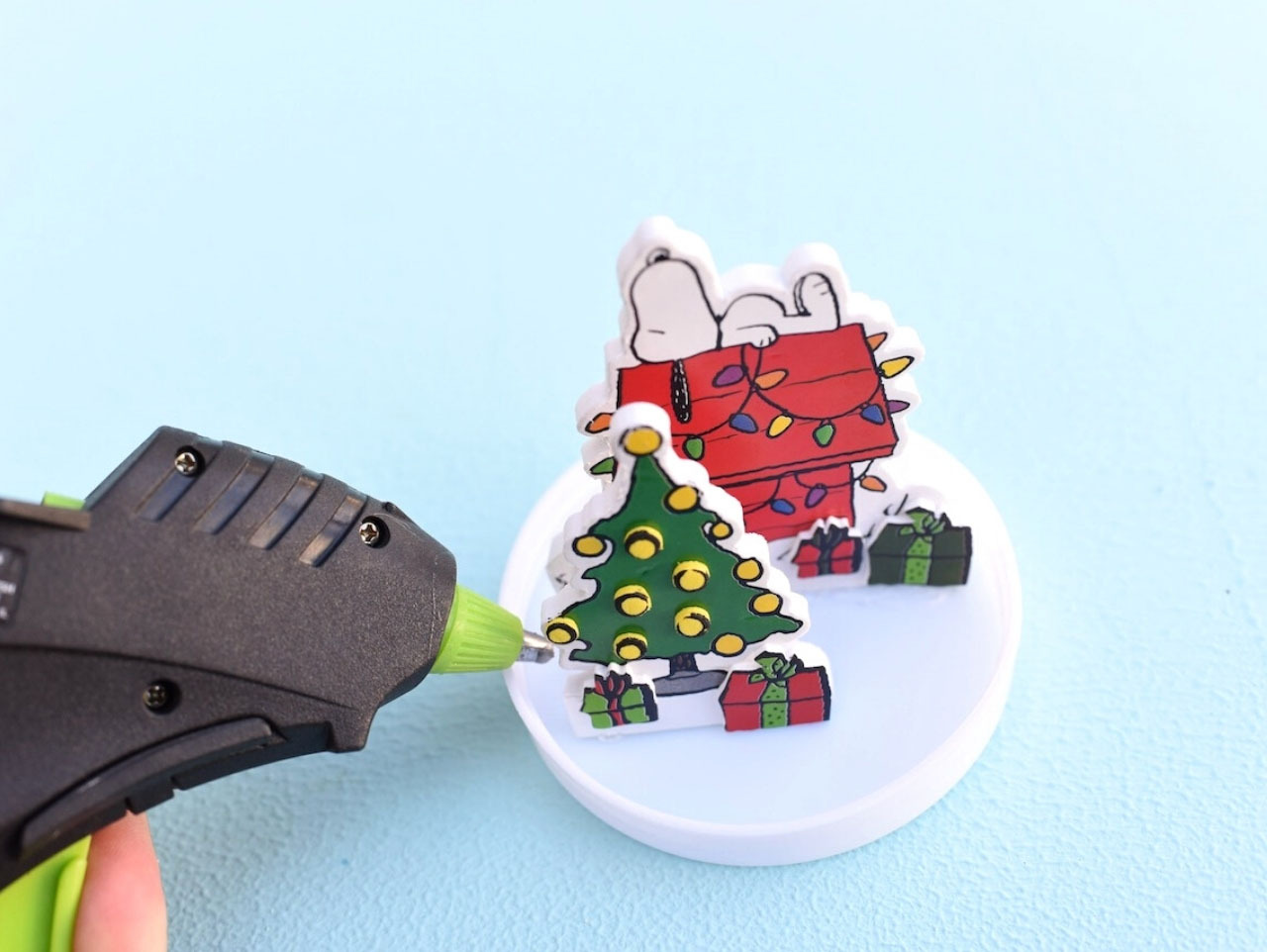Use a glue gun to glue Snoopy's dog house and the Christmas tree onto the inside of the jar lid.