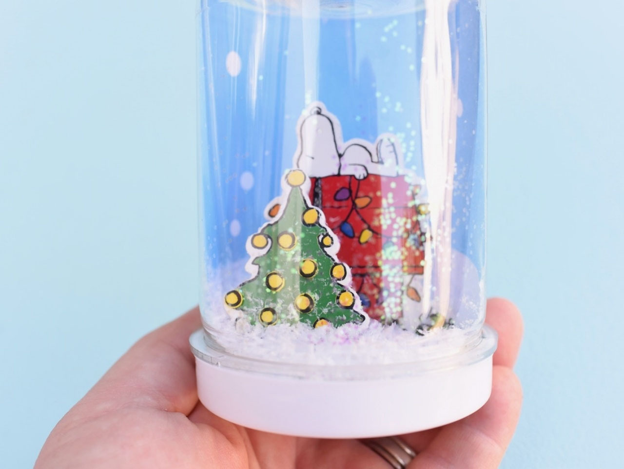 Proudly display your cute new snow globe! Ours was the perfect activity for a Charlie Brown Christmas Party, along with our DIY Snoopy's Dog House Kids Craft. Don't miss out on the tutorial to set up your own Peanuts Themed Food Bar too!