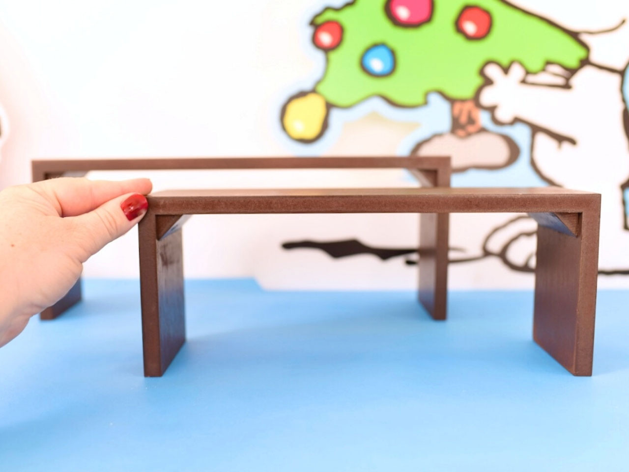 Place the longest wood riser from the wood riser set in the middle of the table. Add the medium sized wood riser in front of the large one.