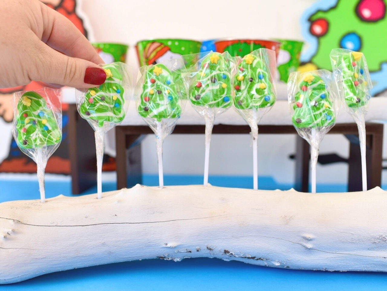 Place green Christmas tree lollipops into a lollipop stand or a piece of wood for a fun display. I used a piece of wood that I'd drilled holes into and spray painted white.