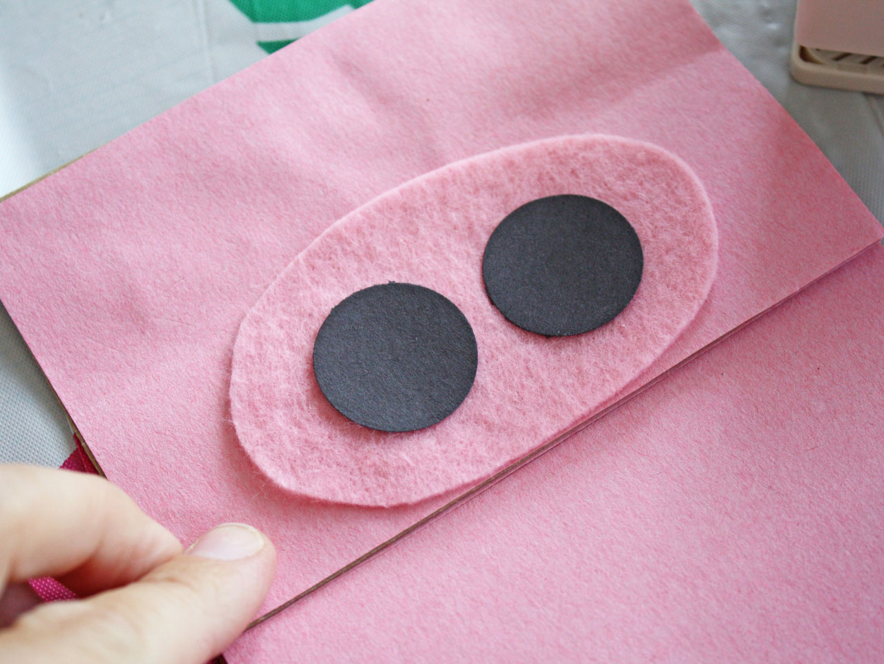 Cover the bag with pink construction paper. Using pink felt, cut a oval for the pig’s snout. Punch two black 1″ circles and glue to the pink felt to make the snout.