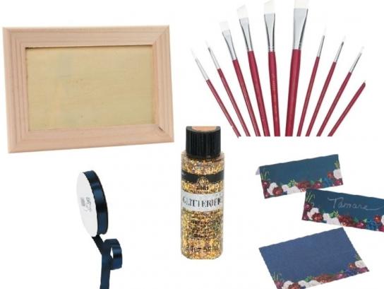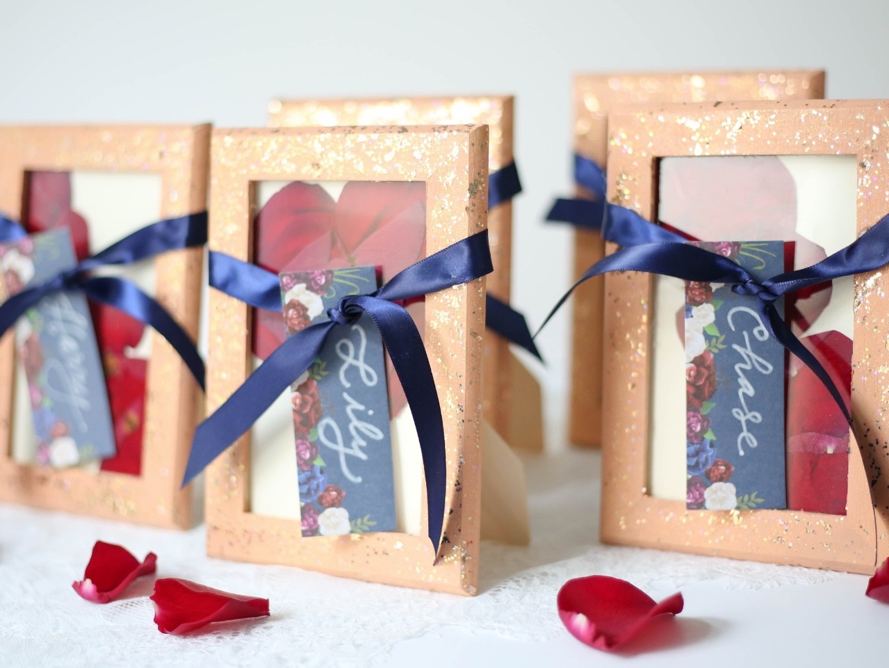 Tie the ribbon around the back of the frame, then add a navy floral placecard (we trimmed it in half and added a hole with a paper punch). Tie in a loose knot. For the names, we found a white fine point paint marker was the perfect tool for scripting our guest's names.