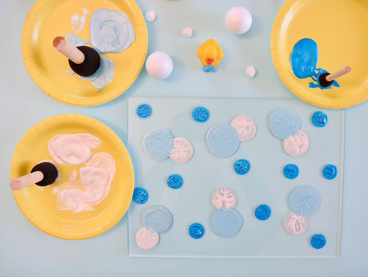 Begin by crafting a sign to draw your guests' attention to the creation station. Use round sponge pouncers from the Dr. Seuss Paintbrush Set to create "bubbles" on a Clear Acrylic Sign with light blue, darker blue and white paint.