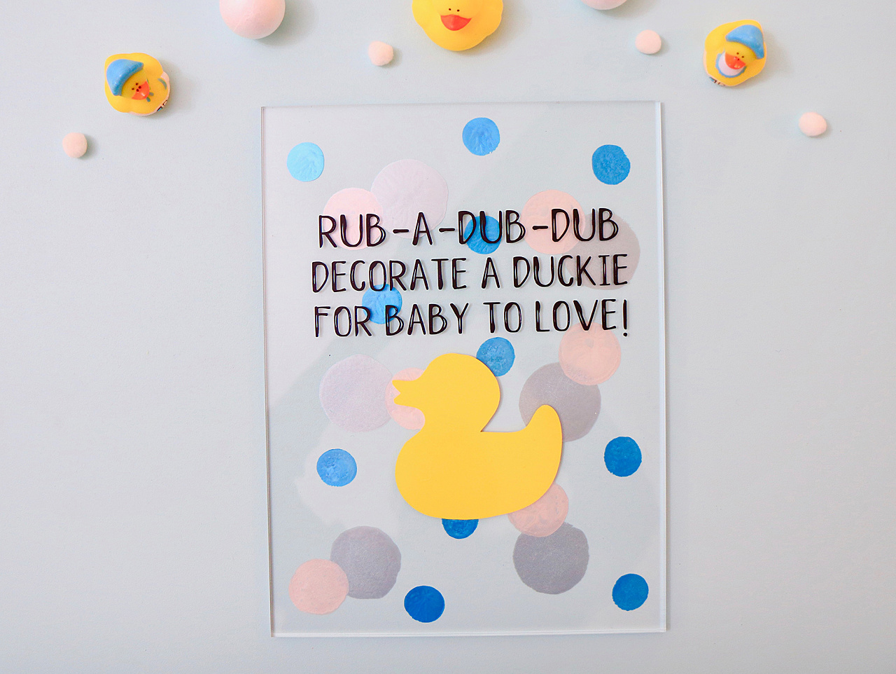 Place the sign, the DIY Rubber Duckies and the pail full of markers on a table during a Rubber Duck Themed Baby Shower and let the fun begin!