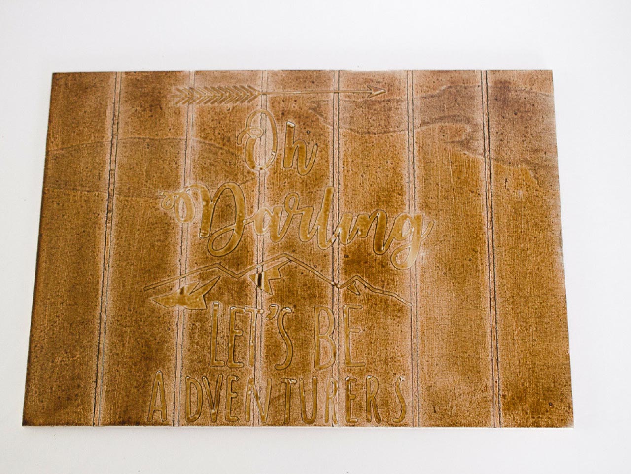 For this next step, bring the sign outside to apply the stain or make sure you’re in a well ventilated area. Using a foam brush, apply stain across the top of the board…vinyl and all. Make sure the stain is getting inside the grooves of the board. As soon as the stain is applied, wipe off the excess with a paper towel. Cover the board completely with the stain and allow to dry outside for 24 hours.