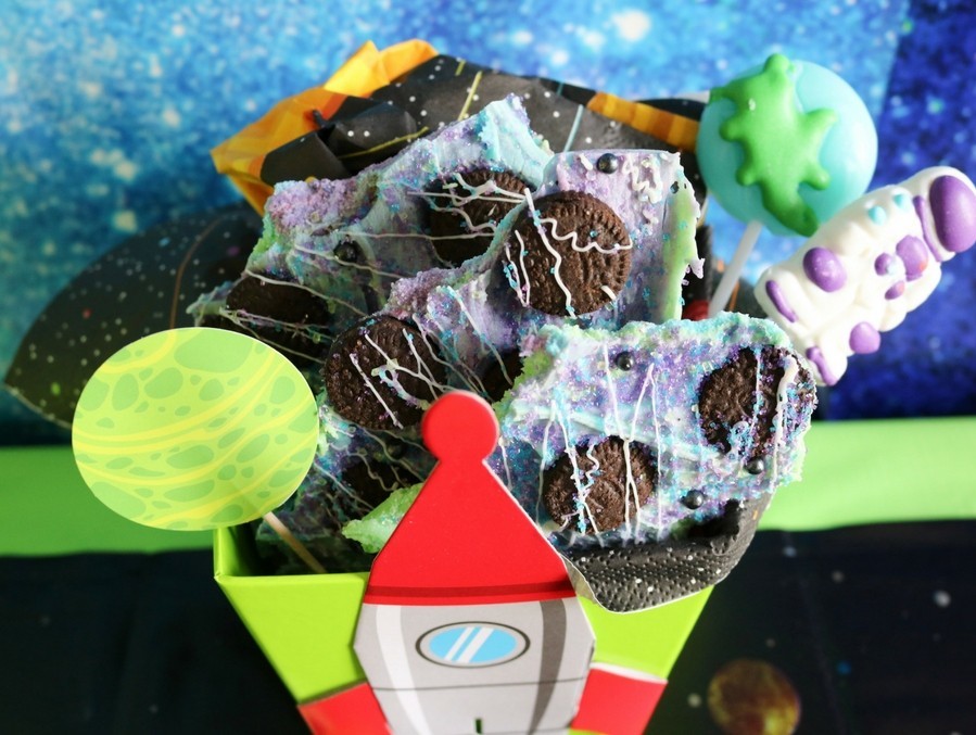 Whip up our simple and delicious Galaxy Cookie Bark Recipe and display it in Lime Green Candy Buckets with Ribbon Handle on each end of the table for guests to grab and go! You can find our recipe for this no bake dessert here!