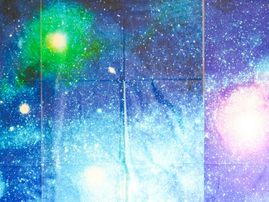 Start creating your DIY backdrop and dessert display by taping up the Space Galaxy Backdrop on your wall. We used double stick tape but feel free to use any tool you don't mind sticking to your wall. The backdrop comes in three pieces. We overlapped them to ensure no wall peeked through our galaxy.