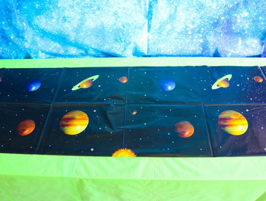 After the Space Galaxy Backdrop has been hung, layer a table in Lime Green Plastic Tablecloth Roll and a Outer Space Plastic Tablecloth. We used our tablecloth as a table runner and left it partially folded to achieve this look.