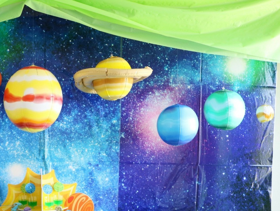 Set up your backdrop stand and camouflage it with an Lime Green Plastic Tablecloth Roll. We held ours in place with a few pieces of well-placed tape. Secure the planets to the backdrop stand at varying heights using a bit of fishing line. Make sure your planets go in order of distance from the sun!