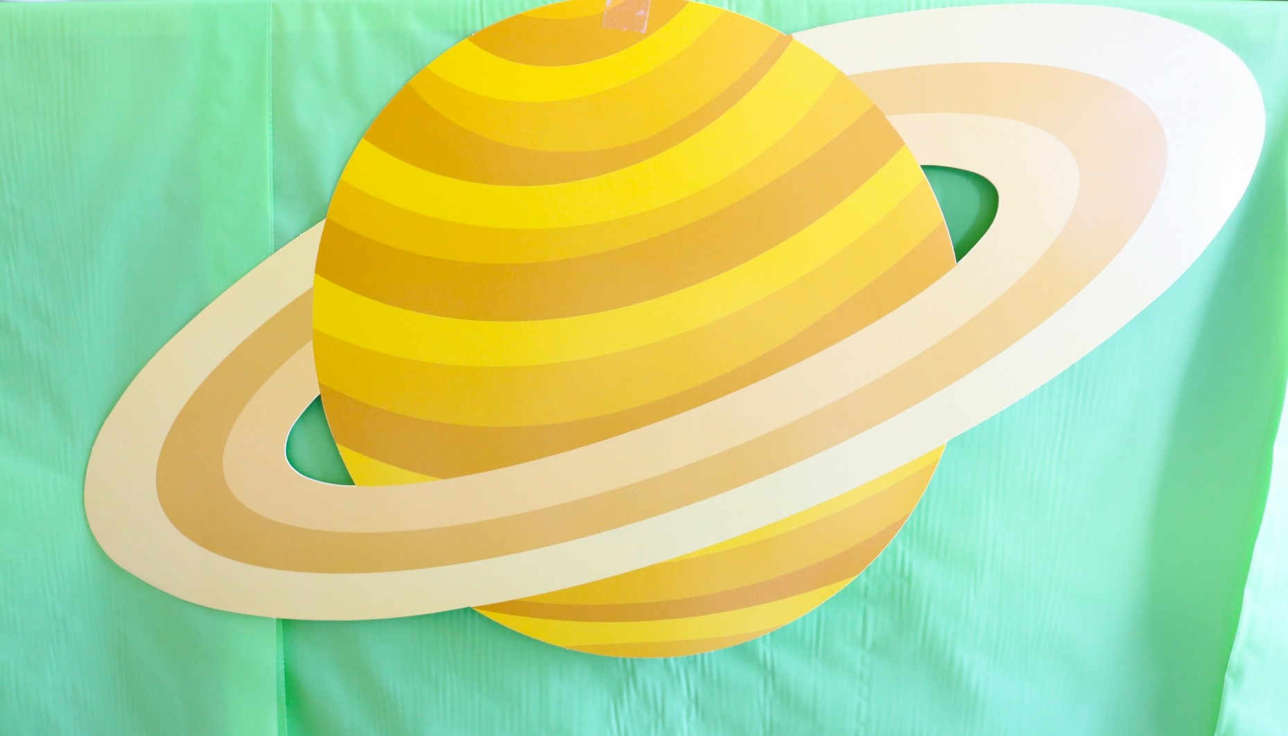 Now, add a planet detail to the front of your table by securing a Space Party Cutout to the table with some double stick tape.