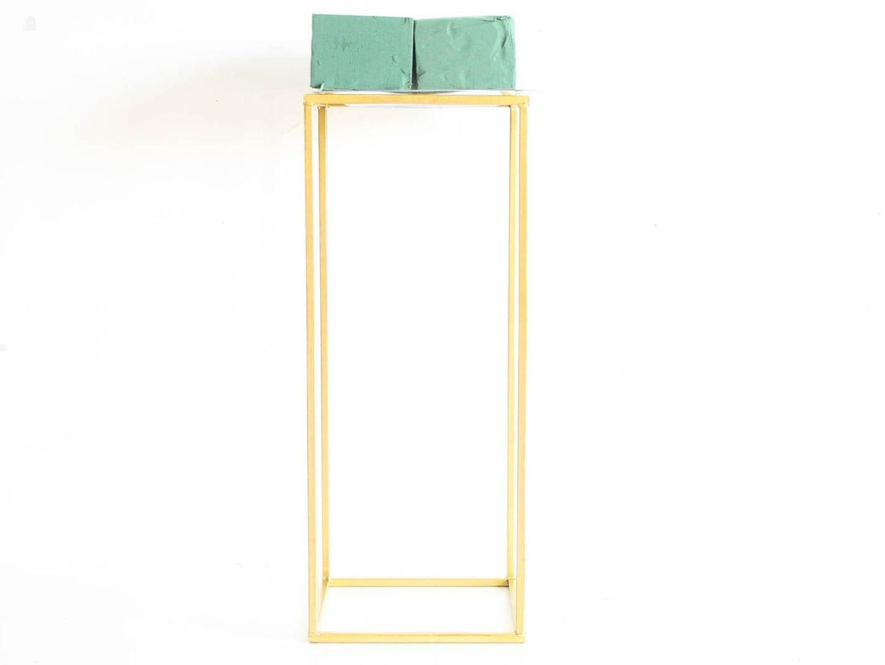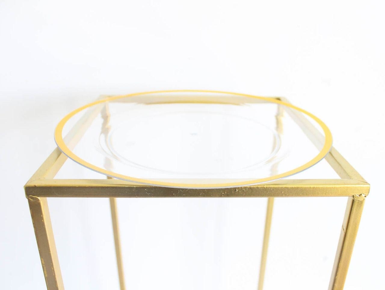 Begin by placing a Clear Plastic Dinner Plate on top of the Large Gold Geometric Stand. It should fit so it balances on the edges of the Stand.