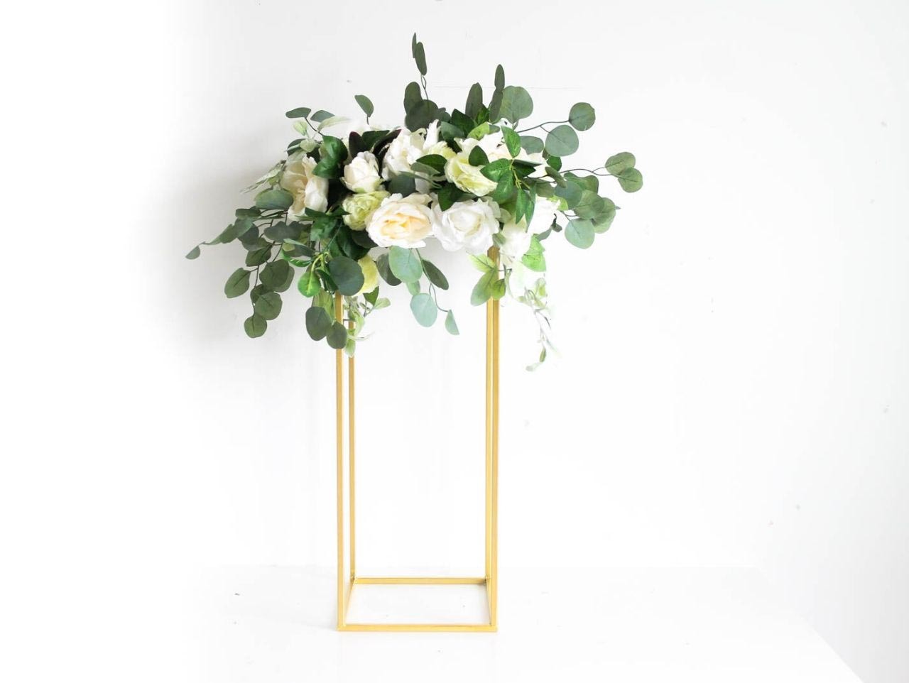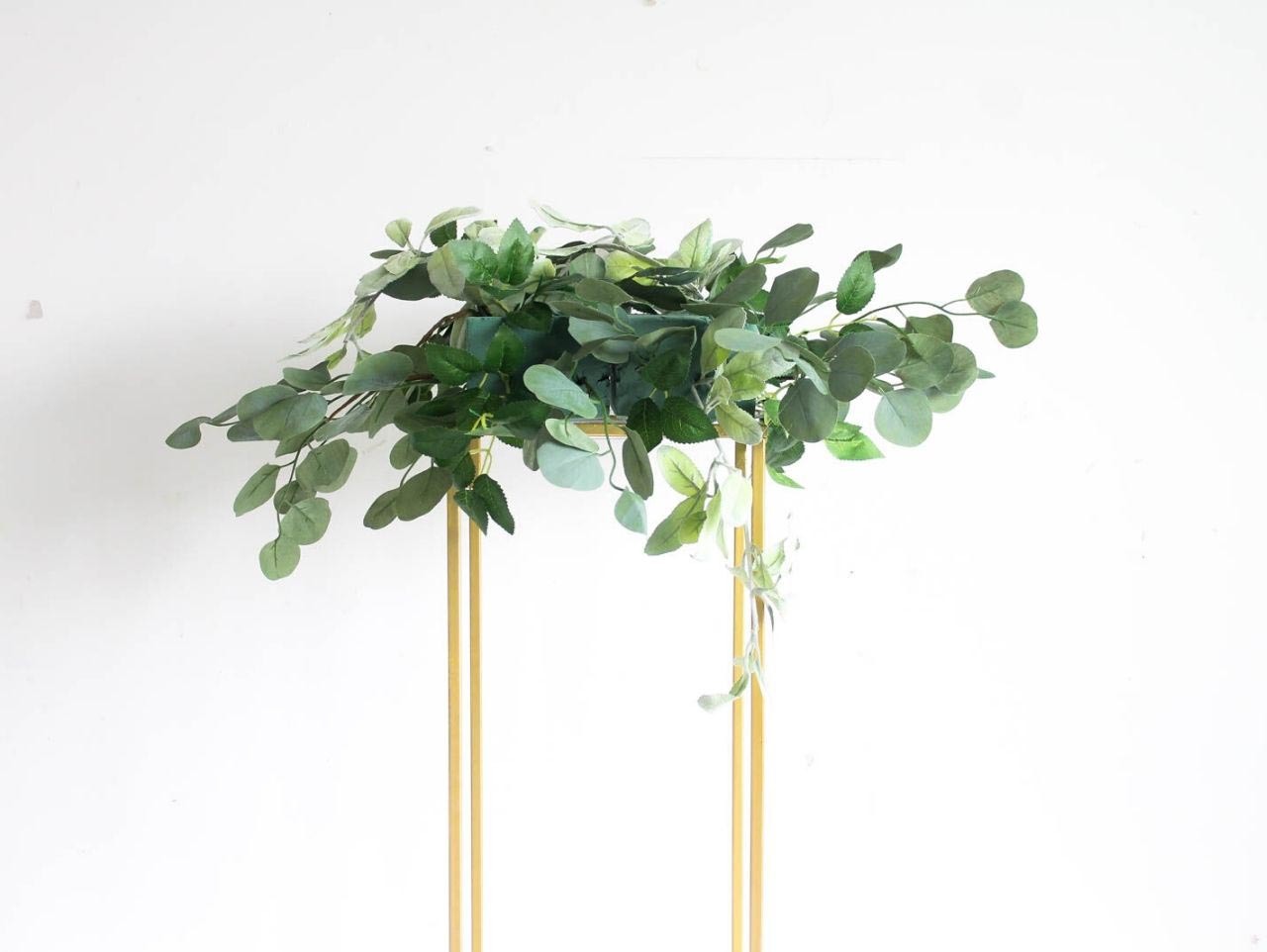 Fill in the Floral Foam with sprigs of Silver Dollar Eucalyptus, Lamb's Ear Garland and greenery from the White Rose Floral Garland. Make sure to have a few pieces of greenery cascading down the sides of the stand to add a bit of dimension to the centerpiece.