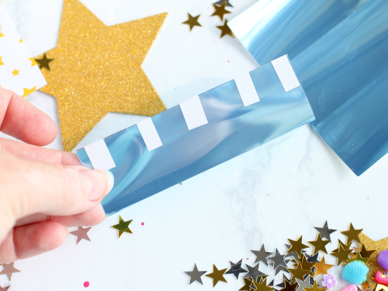 Take the reflective material provided in the DIY Kaleidoscope Kit, fold it, and use the small white stickers to secure in place. Insert the reflective material into the cardboard tube.