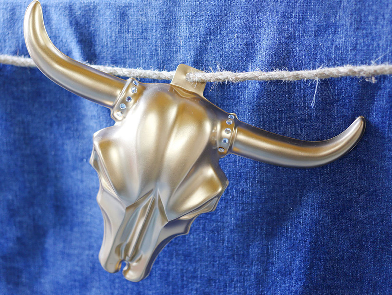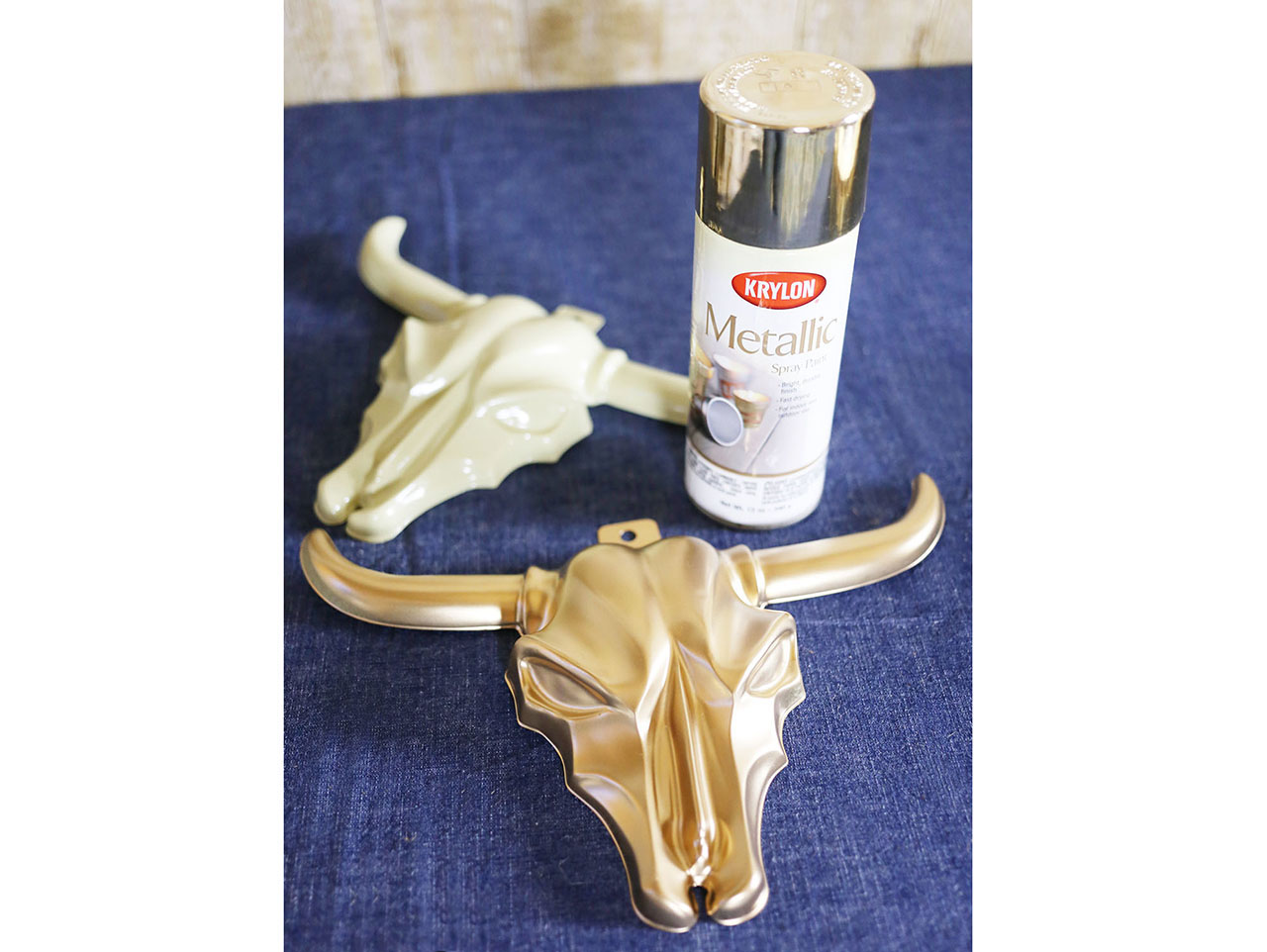 Using a metallic gold spray paint, paint the entire outside of 5 of the Steer Head Wall Decorations and let fully dry. You will need at least 2 coats of paint. Be sure to let the first coat dry before you do the second coat.